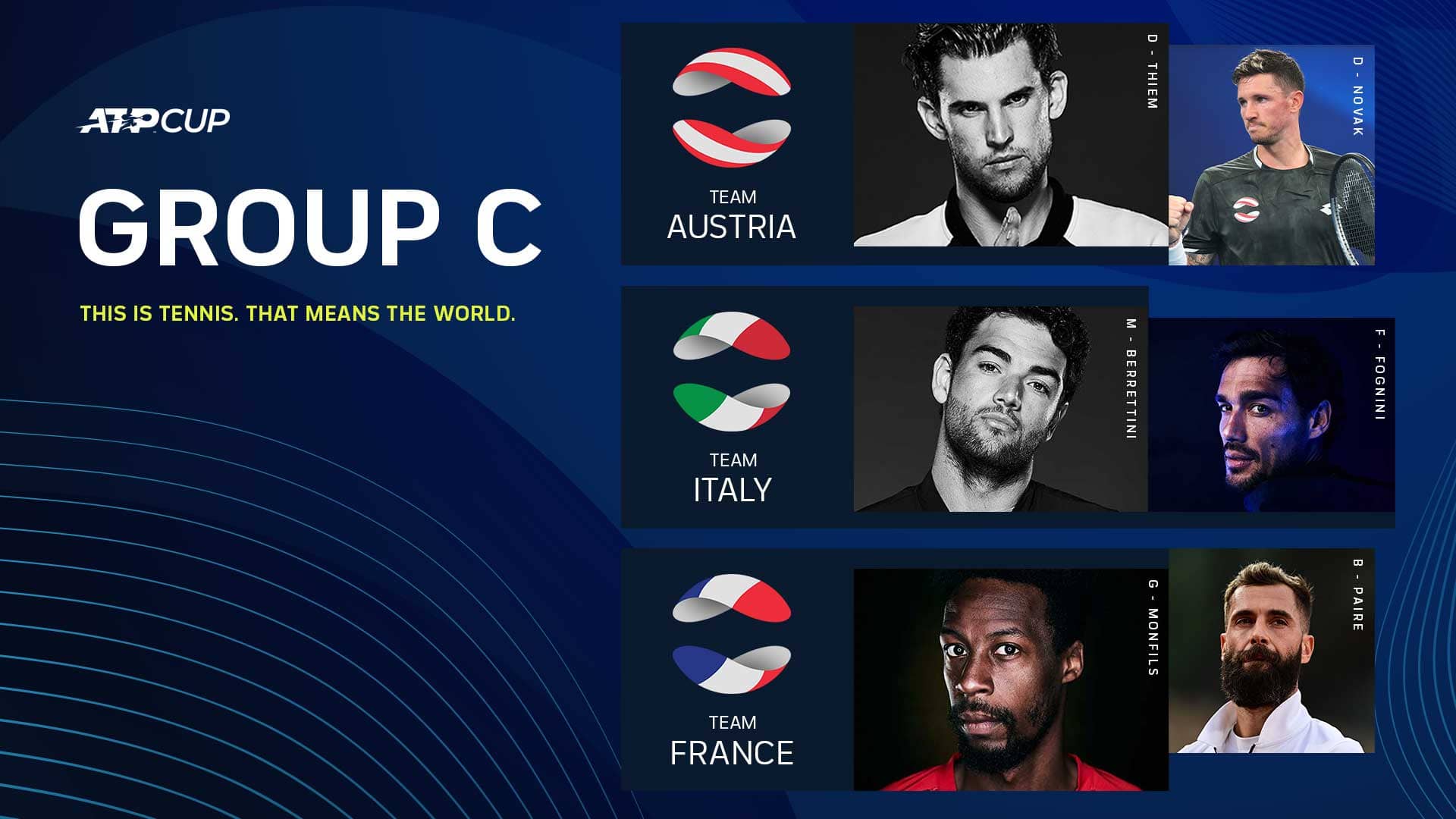 ITALIA: Matteo Berrettini, Fabio Fognini, Simone Bolelli, Andrea Vavassori (capitano: Vincenzo Santopadre)