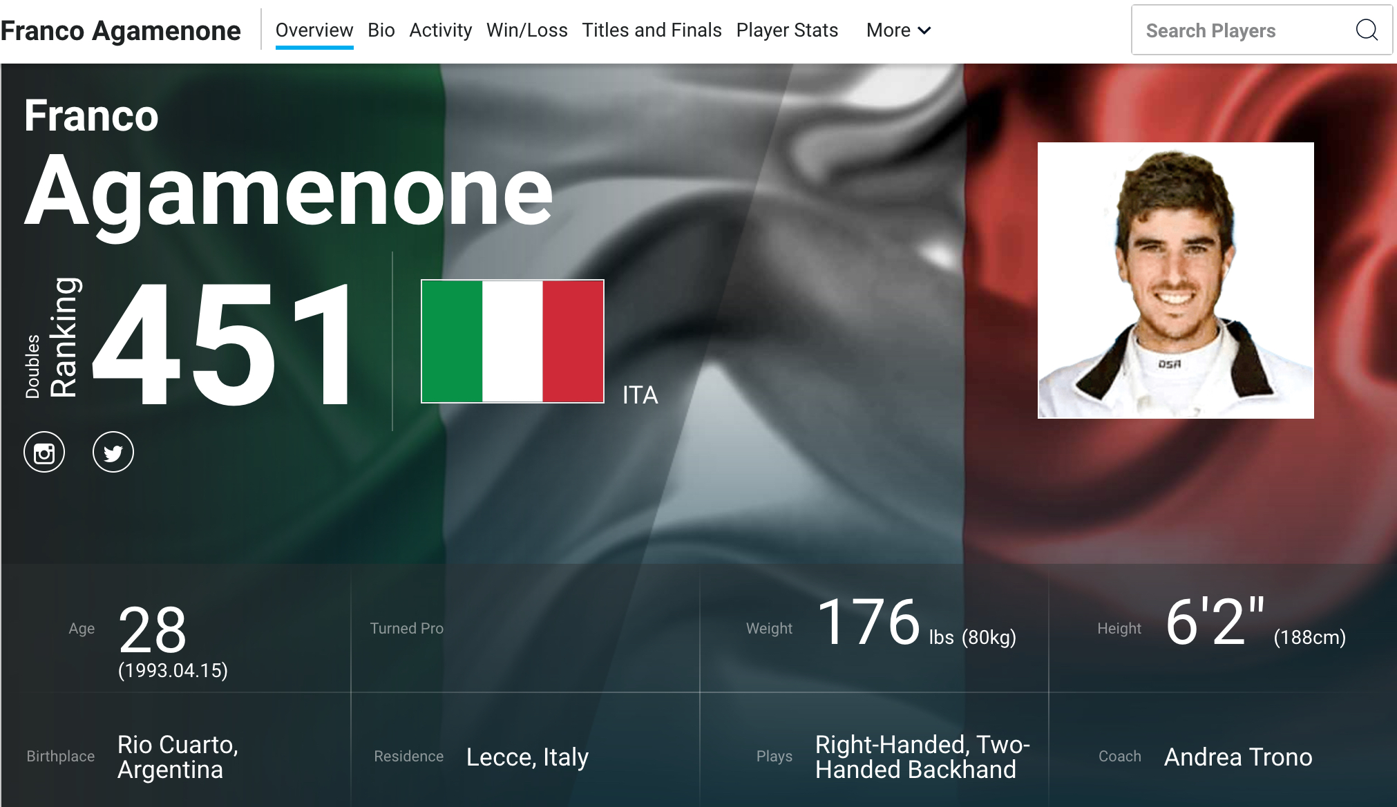 Ha da sempre il doppio passaporto, ma fino al 2020 giocava con la bandiera argentina accanto al suo nome. Poi, lo scorso novembre Franco Agamenone ha deciso di cambiare vita, cambiando pure la sua patria tennistica: trasferimento (con la fidanzata) da Rio Cuarto, non lontano da Cordoba, a Lecce, con un tricolore da difendere e un sogno chiamato Internazionali Bnl d'Italia.