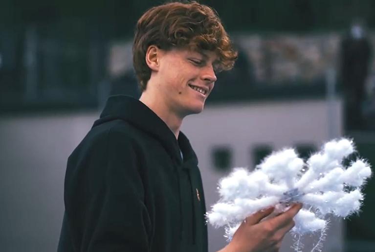 Babbo Natale o Gesù bambino? Nel video di Natale del Piatti Tennis Center di Bordighera Jannik Sinner fa il miracolo: tira una palla dritta verso il cielo e questa, quando scende e gli torna tra i piedi, si è trasformata in un grande, candido fiocco di neve.