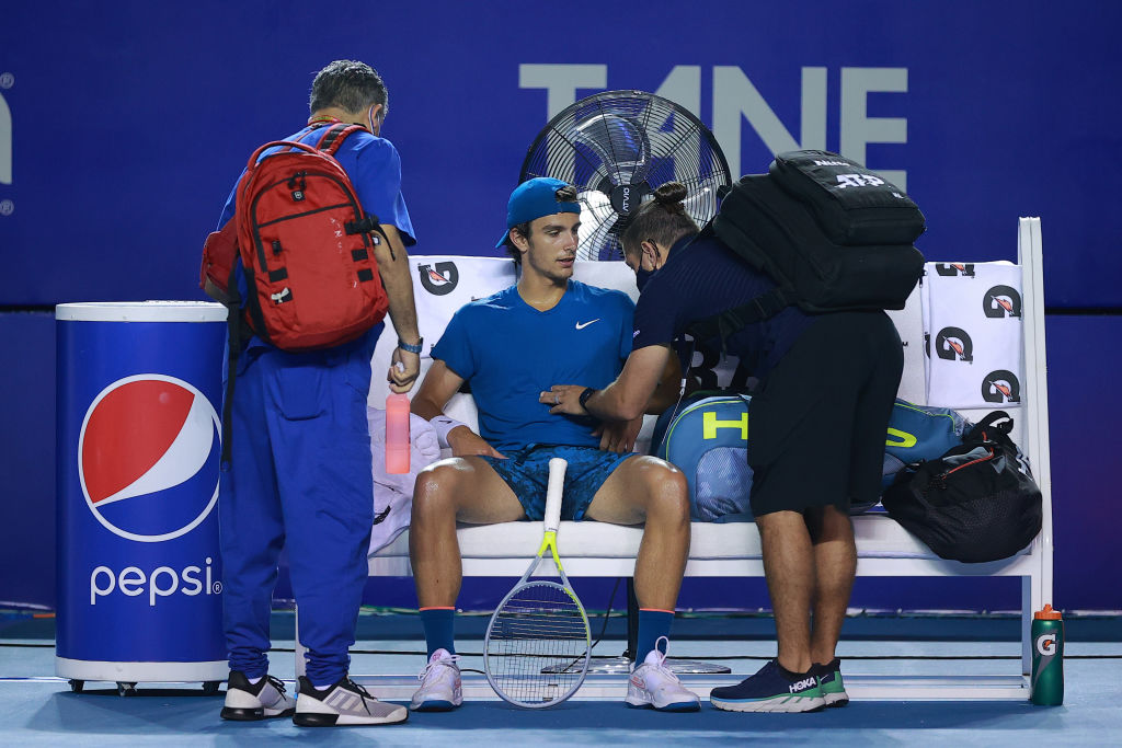 Lorenzo Musetti a colloquio con medico e fisioterapista (foto Getty Images)
