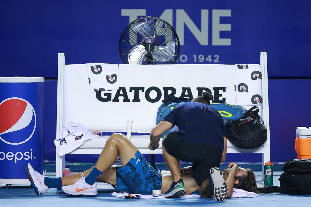 A fine primo set, sotto lo sguardo preoccupato del suo coach Simone Tartarini, il 19enne di Carrara ha chiesto l’intervento del fisioterapista per un trattamento agli addominali (nella parte centro-sinistra del torace), mentre il pubblico messicano durante il medical time-out intonava cori di incitamento per il talento italiano. Il quale è rientrato in campo intenzionato comunque a giocarsi la partita, tenendo il suo turno di servizio - prima volta avanti nel punteggio - e portando ai vantaggi il 22enne di Atene, che si è tolto d’impaccio con un ace e un drop shot.