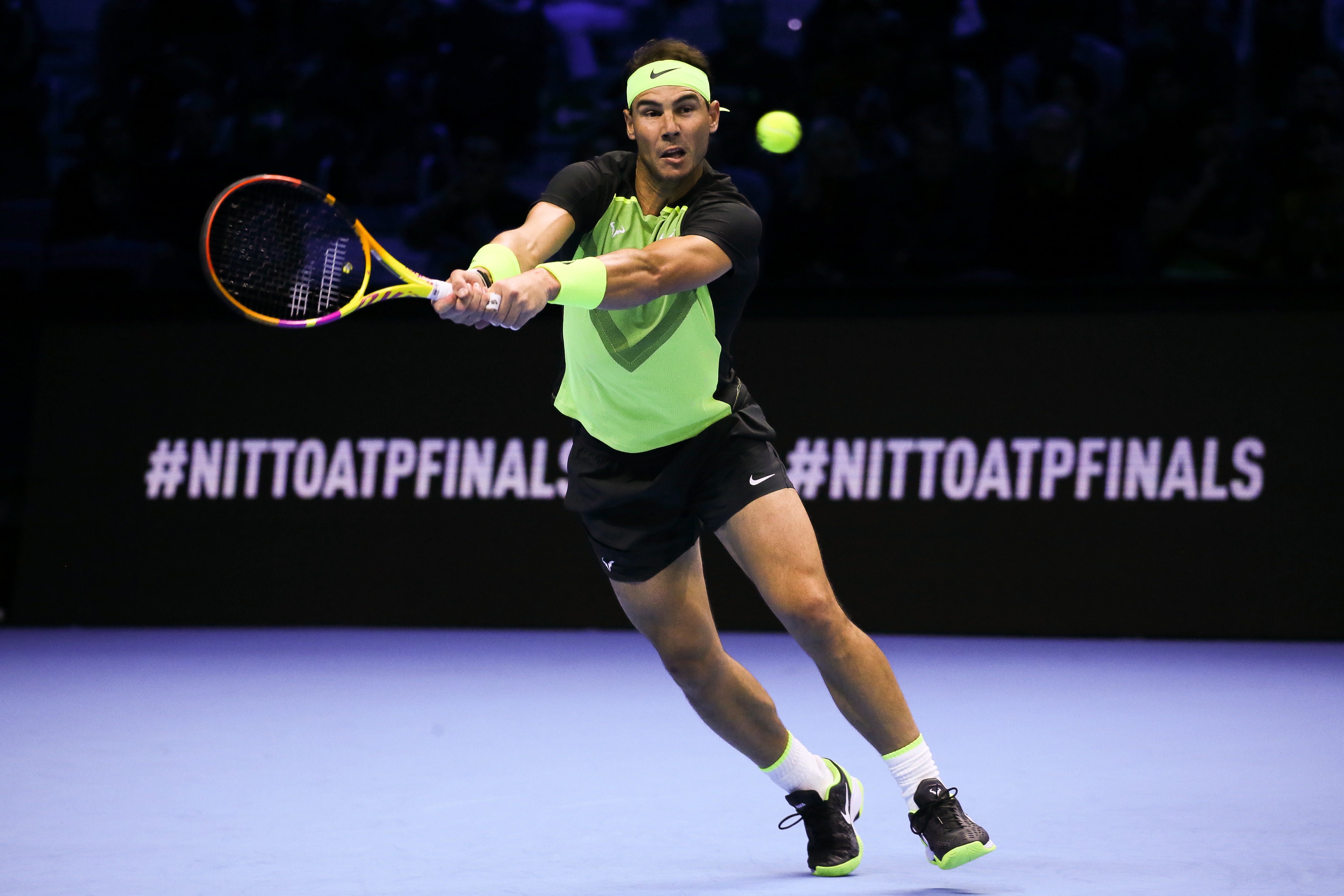 Rafa Nadal impegnato contro Felix Auger-Aliassime alle Nitto ATP Finals (Foto Sposito)