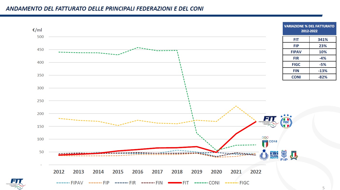 Anche in questo caso la crescita degli anni è scritta nei numeri. La Federazione Italiana Tennis e Padel chiuderà il 2022 con un fatturato integrato vicino ai 170 milioni di euro, un dato molto superiore alle stime del bilancio preventivo, e dovrebbe superare tale soglia nel 2023. Difficile immaginare un andamento simile nel 2002, quando tale fatturato raggiungeva appena 15 milioni di euro.