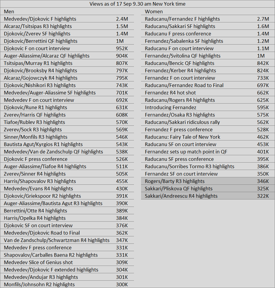 I dati relativi alle visualizzazioni degli highlights su You Tube mettono Raducanu-Fernandez davanti a Djokovic-Medvedev. E anche le semifinali del torneo femminile battono quelle della prova maschile