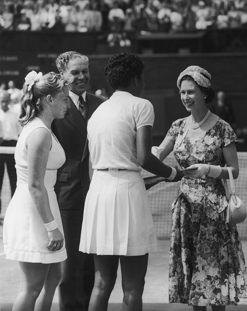 La prima risale alla finale del 1957 in cui Althea Gibson diventò la prima tennista nera nell'albo d'oro dei Championships in singolare. La statunitense ha raccontato il suo incontro con la regina nel suo libro autobiografico “I Always Wanted To Be Somebody” del 1960.