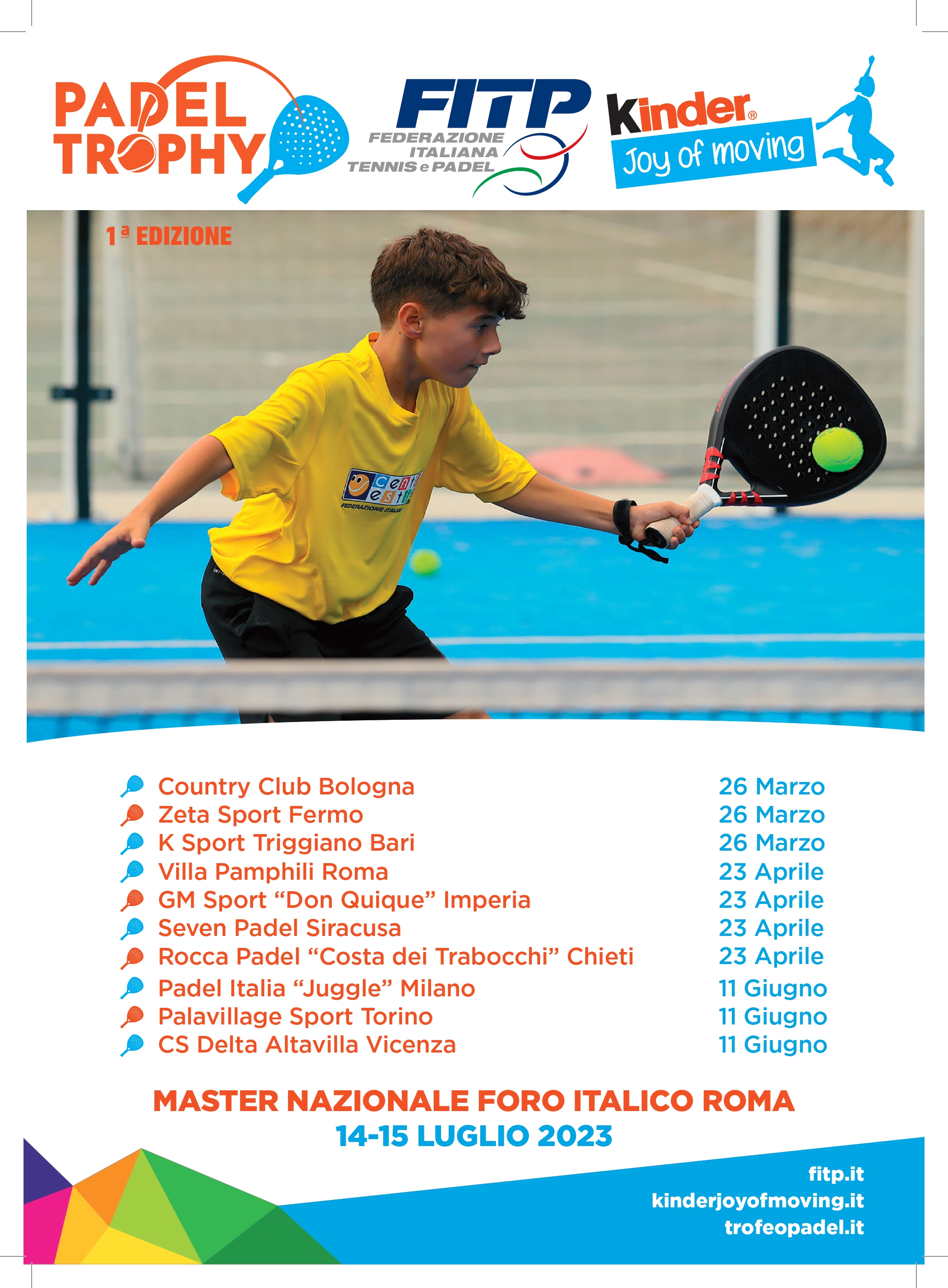 Sulla scia di quanto avviene ormai da anni con il tennis, infatti, i promotori del Tennis Trophy Fitp Kinder Joy of Moving si sono prodigati per predisporre un nuovo circuito promozionale giovanile di padel per ragazzi e ragazze dai 9 ai 17 anni ispirato alla gioia di muoversi, di socializzare e di crescere nel rispetto delle regole e del fair play. Dal 26 marzo all’11 giugno sono in programma 10 tappe in giro per l’Italia, al fine di coinvolgere tanti aspiranti padelisti, i migliori dei quali prenderanno parte al Master nazionale previsto al Foro Italico di Roma, il 14 e 15 luglio.