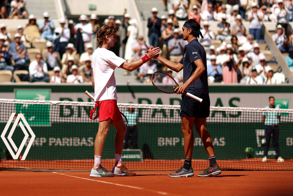 Il saluto a fine match tra Andrey Rublev e Lorenzo Sonego (foto Getty Images)