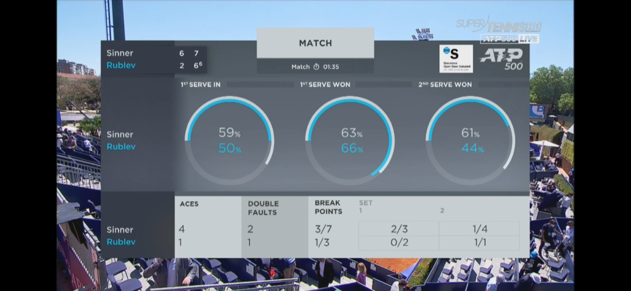 Sinner tiene il ritmo, arriva bene e accelera. Al russo la palla torna indietro ancora più veloce. L'azzurro risponde bene, ha qualche incertezza senza grosse conseguenze al servizio, ma contro il numero 7 del mondo si gioca alle sue condizioni.