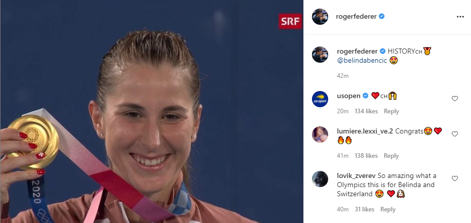 Proprio Federer ha celebrato su Instagram il trionfo di Belinda Bencic, con cui ha giocato e vinto in passato la Hopman Cup, torneo-esibizione sotto l'egida dell'ITF che si svolgeva a Perth alla vigilia dell'Australian Open. Federer e Bencic avrebbero dovuto disputare insieme anche il torneo di doppio misto a Tokyo 2020, ipotesi naufragata però dopo il forfait del 20 volte campione Slam che ha dovuto rinunciare alla trasferta per queste Olimpiadi.