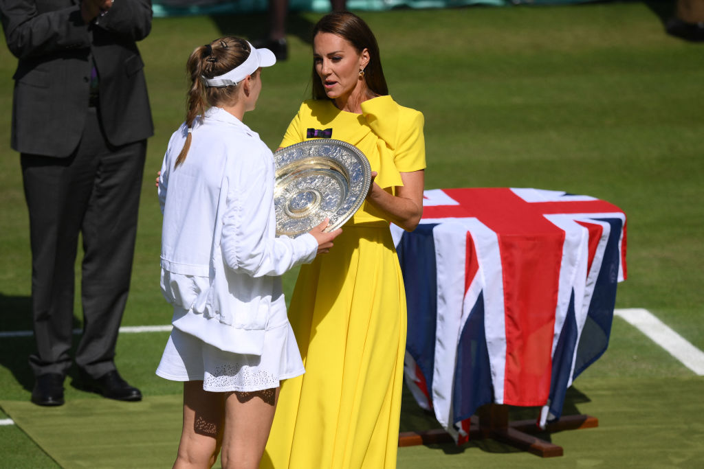 Jabeur, che nel percorso fino alla finale ha ottenuto il 46% dei punti in risposta contro la prima e il 47% dei break, dal secondo set si perde. La varietà diventa confusione mentre Rybakina, dal tennis più lineare, riprende l'efficacia vista nel resto del torneo. E scivola senza timori e inciampi verso il momento in cui riceve il Venus Rosewater Dish dalla Duchessa di Kent di giallo vestita.