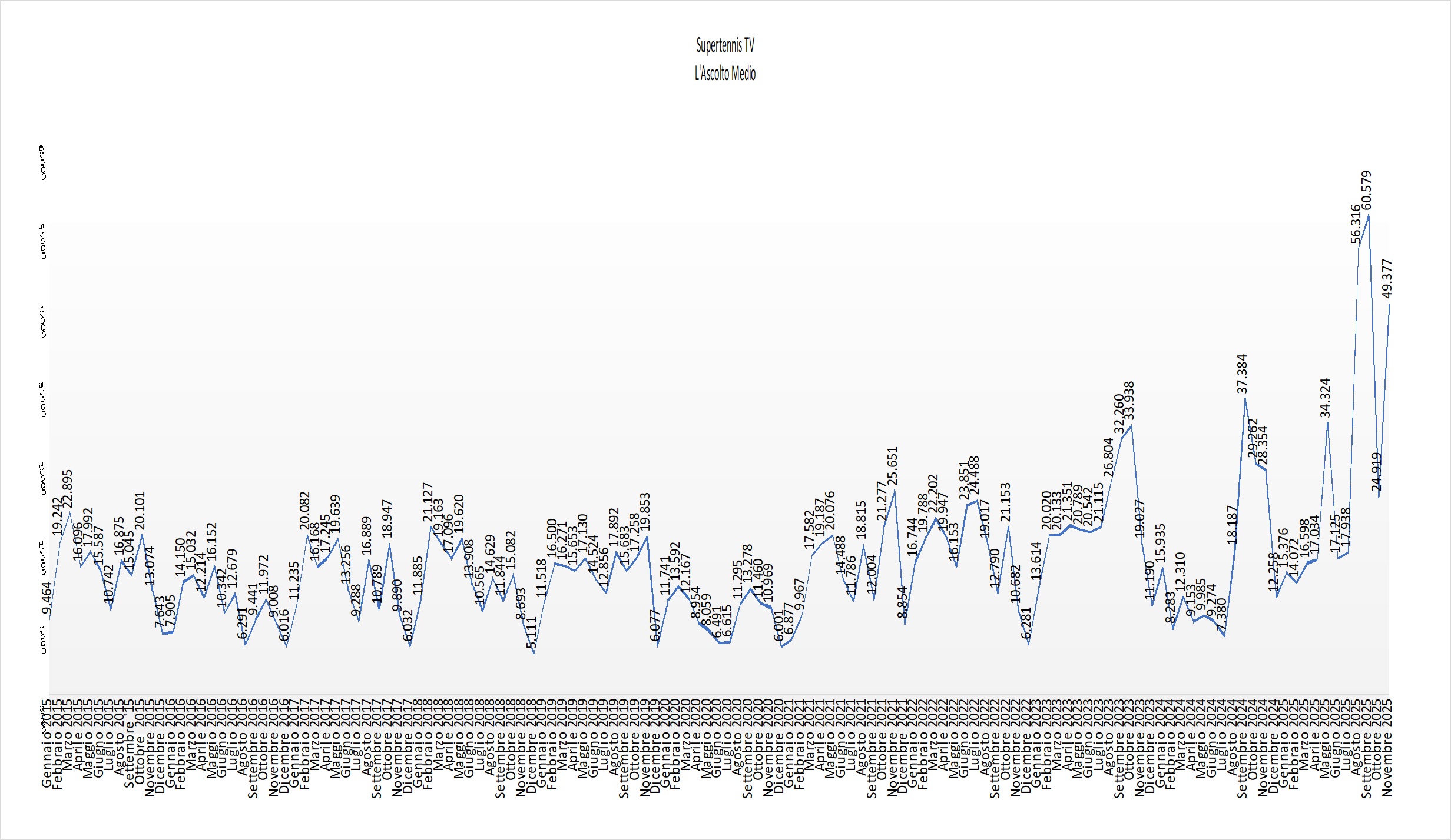 In termini di ascolto medio, solo altri due mesi, in tutta la vita del canale, hanno fatto registrare medie più elevate, entrambi nel 2025. Si tratta di agosto e settembre, in cui l'Italia ha festeggiato prima il successo di Jannik Sinner in singolare e della coppia Sara Errani/Andrea Vavassori in doppio, poi il secondo titolo consecutivo della nazionale di Tathiana Garbin in Billie Jean King Cup.