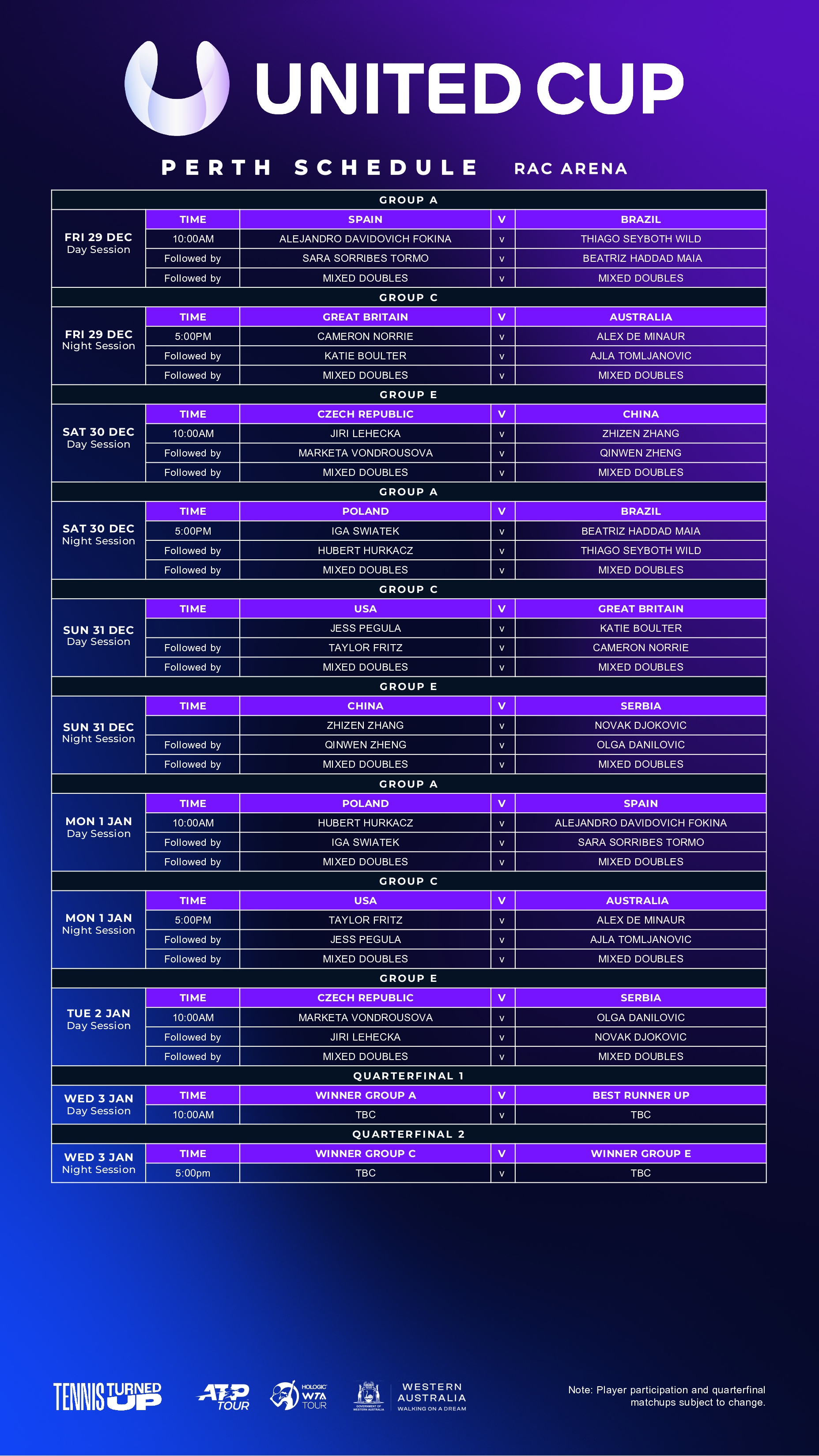 Iniziamo dai gironi di Perth. Nel Gruppo A la Polonia si presenta con una delle combinazioni di numeri 1 migliori della manifestazione: la n. 1 WTA Iga Swiatek e il n.9 ATP Hubert Hurkacz, re degli ace nel 2023. La Spagna sarà guidata da Alejandro Davidovich Fokina, n.26 ATP, al debutto in United Cup, e da Sara Sorribes Tormo. Saranno invece Beatriz Haddad Maia, numero 11 WTA, e Thiago Seyboth Wild, capace di sorprendere Daniil Medvedev all'ultimo Roland Garros, i primi singolaristi del Brasile.