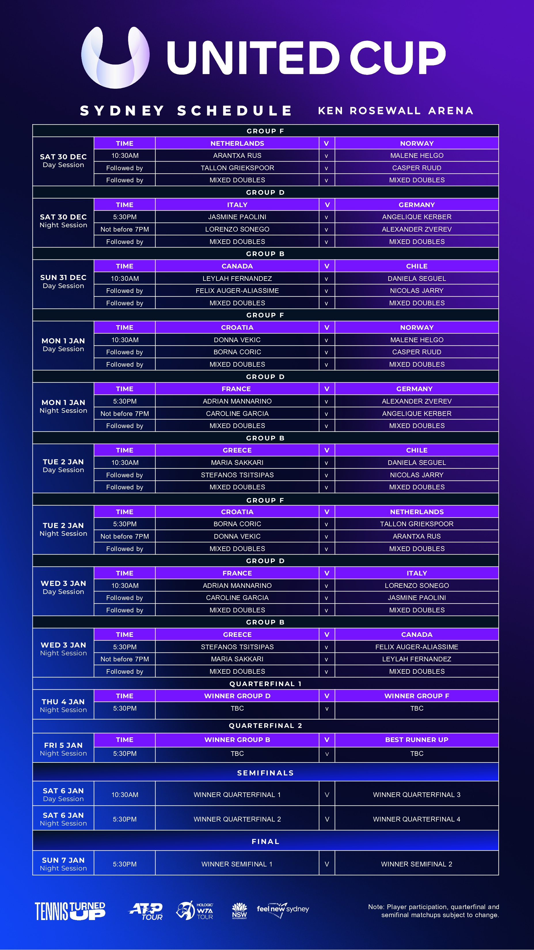 Infine nel Gruppo F la Croazia conta su Donna Vekic e Borna Coric, l'Olanda su un Tallon Griekspoor che ha appena chiuso la stagione migliore in carriera e su Arantxa Rus, la Norvegia sul finalista del Roland Garros Casper Ruud e Malene Helgo.