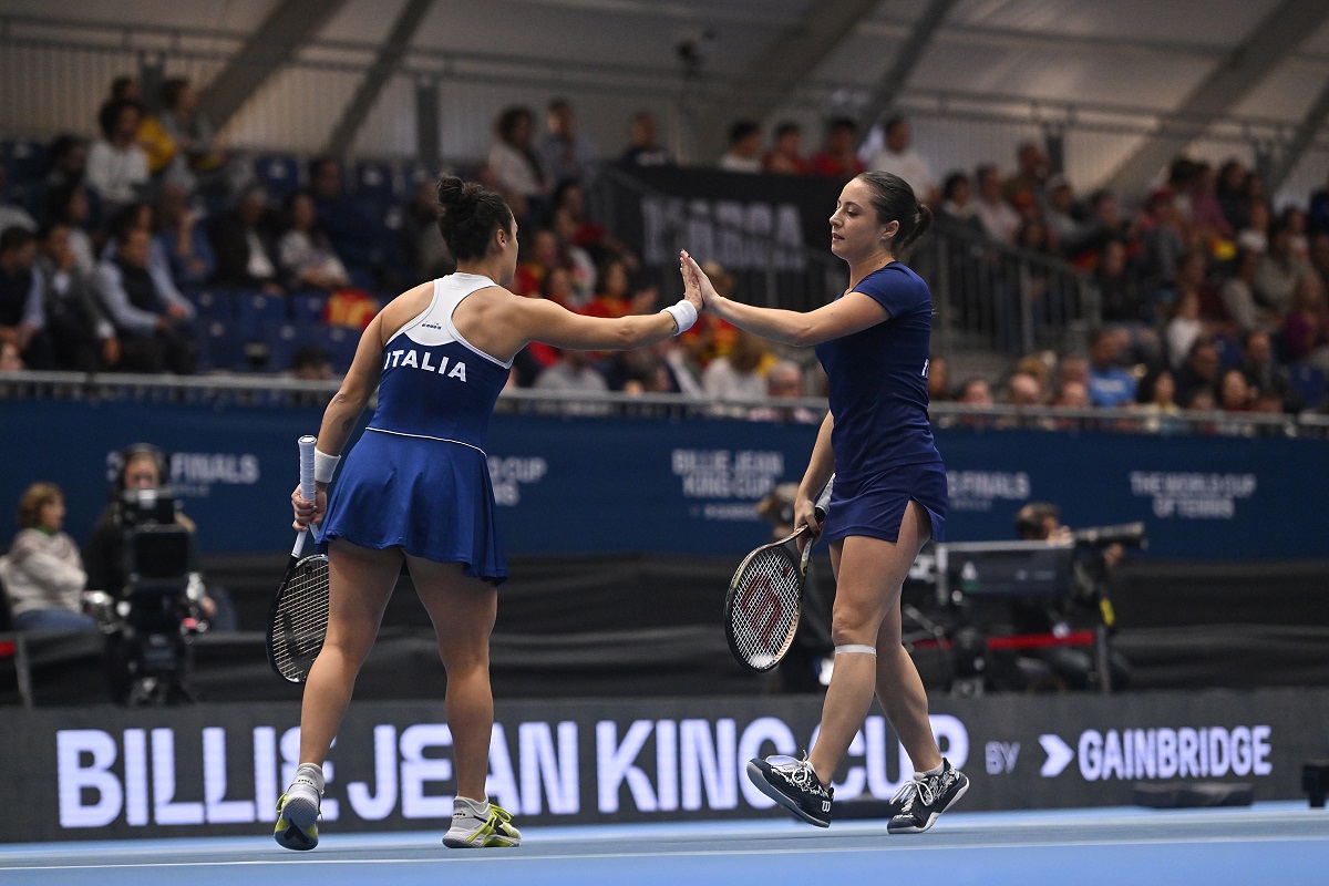 Grande vittoria dell’Italia sulla Francia alle Billie Jean King Cup by Gainbridge Finals che si stanno disputando sul veloce indoor dell’Estadio de la Cartuja di Siviglia. Nel primo singolare Martina Trevisan, n.43 WTA, ha battuto in rimonta per 26 62 62, in due ore e 12 minuti di partita, Alizé Cornet, n.118 del ranking. Quindi Jasmine Paolini, n.30 WTA, si è imposta per 76(6) 57 64, dopo una battaglia di due ore e 39 minuti, su Caroline Garcia, n.20 WTA. Giovedì azzurre di nuovo in campo contro la Germania.