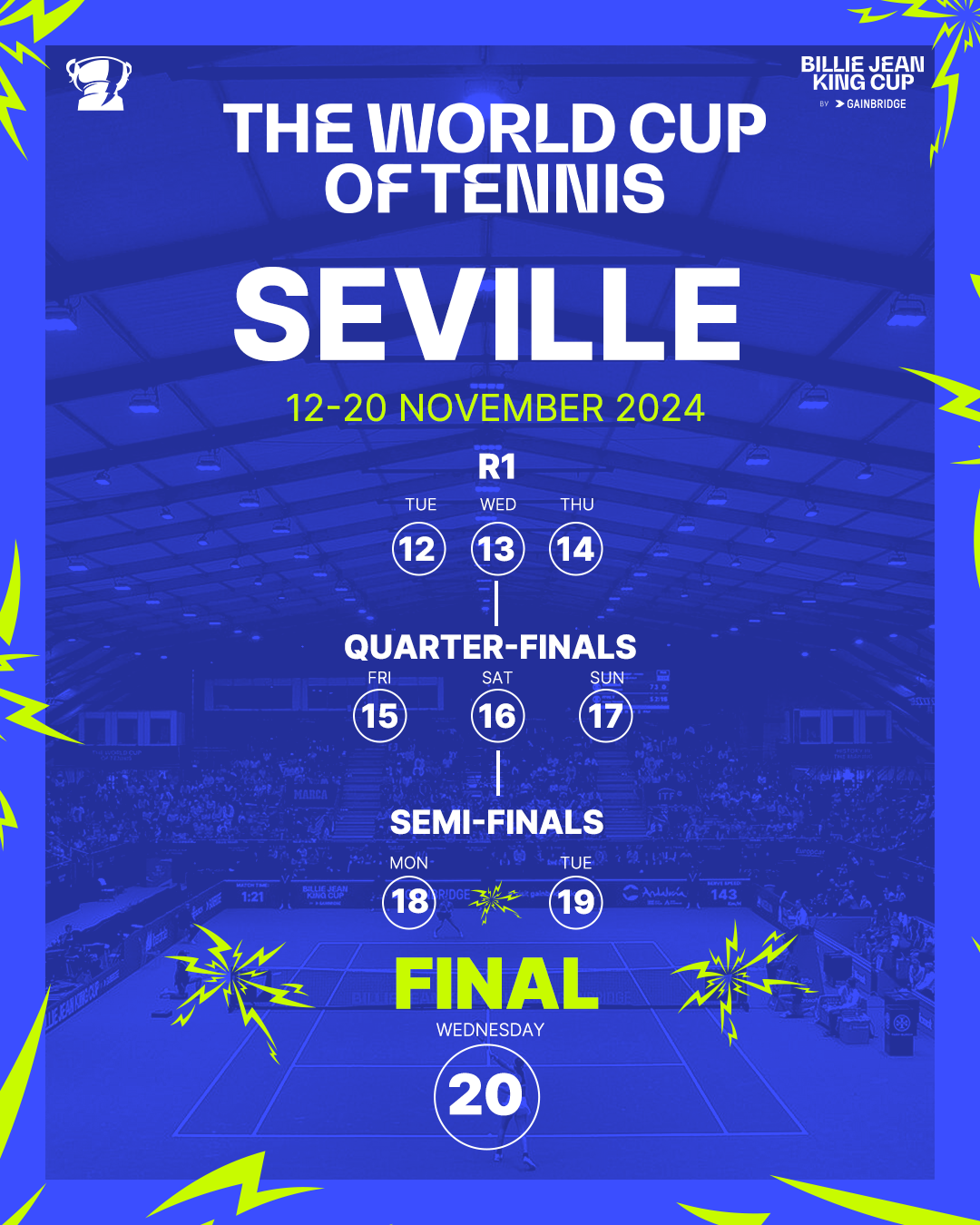 Le Billie Jean King Cup Finals sono in programma dal 12 al 20 novembre, un periodo particolarmente denso in calendario: dal 10 al 17 infatti ci sono le Nitto ATP Finals a Torino e dal 19 le Davis Cup Finals a Malaga.