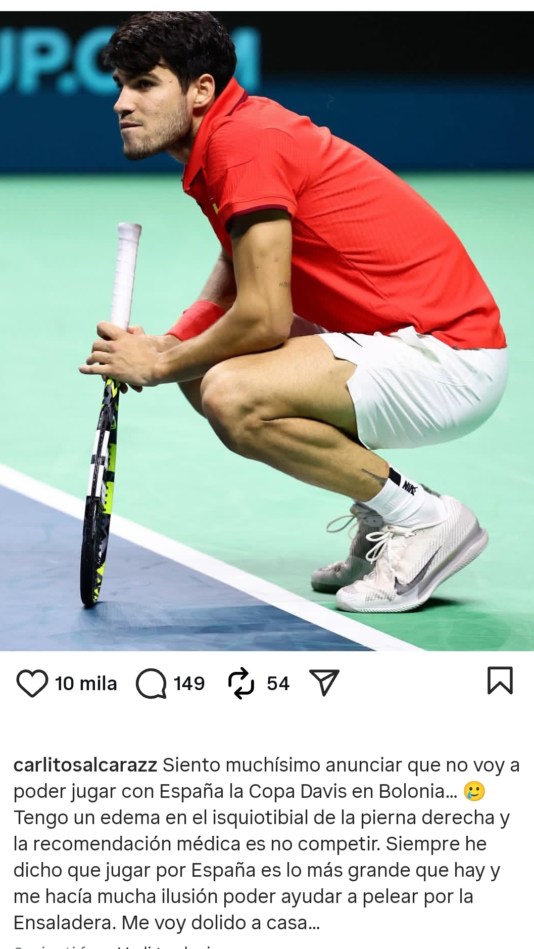 "Sono davvero dispiaciuto di annunciare che non potrò giocare con la Spagna la Coppa Davis a Bologna - ha scritto - Ho un edema all’ischiocrurale della gamba destra e la raccomandazione medica è di non competere. Ho sempre detto che giocare per la Spagna è la cosa più grande che ci sia e mi entusiasmava molto poter aiutare a lottare per l’Insalatiera. Me ne torno a casa con dolore…".