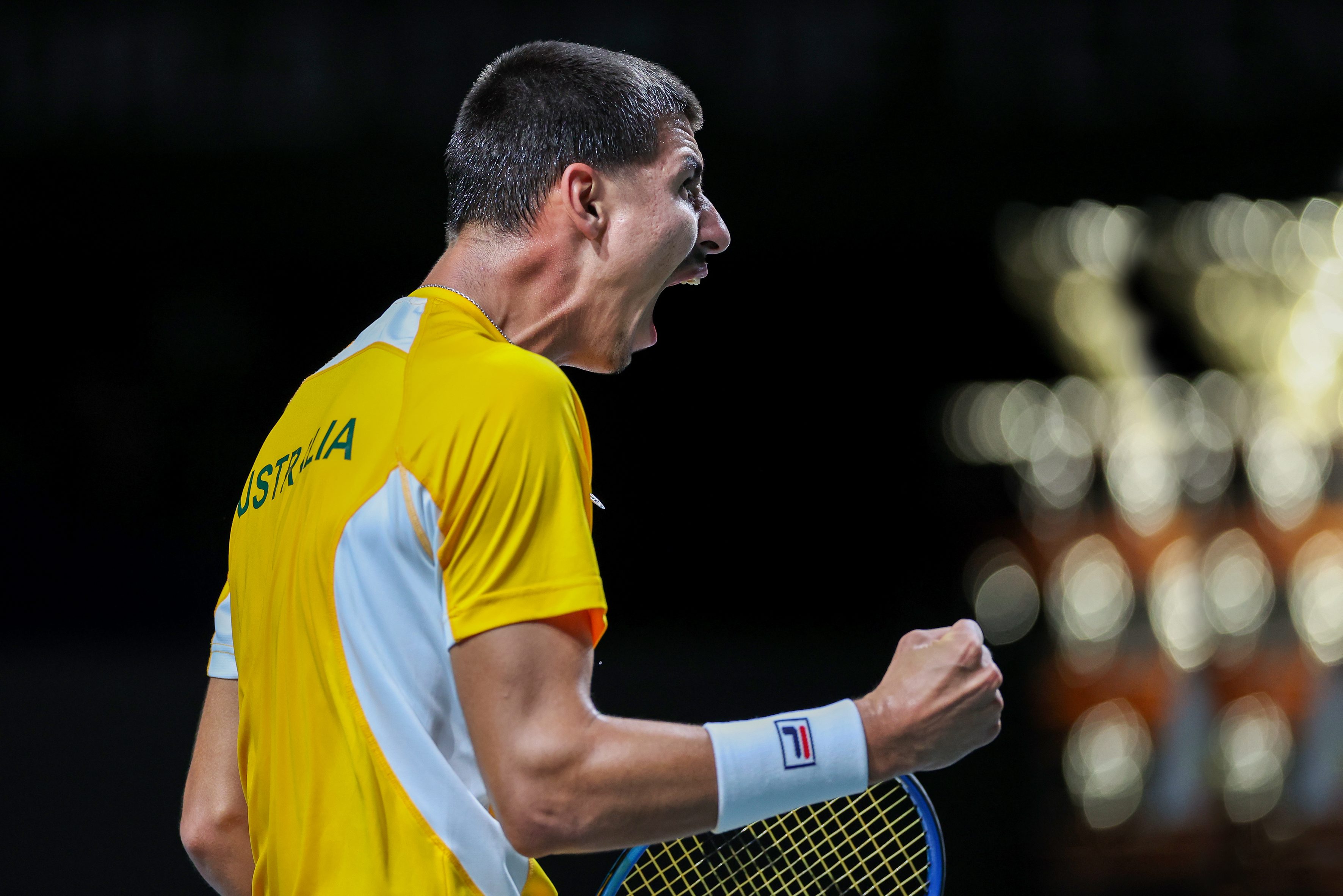 L'esultanza di Alex De Minaur in Coppa Davis (Sposito/FITP)