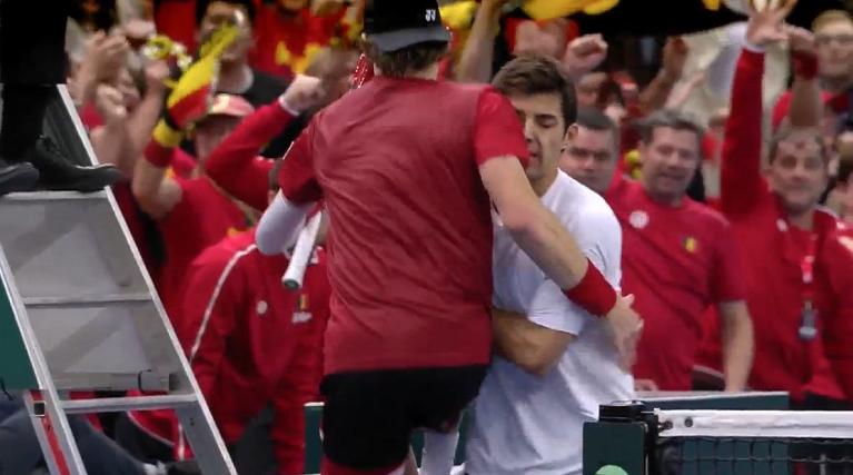Nel match che ha portato ai padroni di casa il punto del 3-1 Zizou Bergs ha sconfitto il cileno 63 46 75 ma questa non è la parte centrale della storia. Dopo il passante in diagonale con cui ottiene il break del 6-5 nel terzo set Bergs corre a braccia alzate verso il lato lungo del campo dove c'è la sedia dell'arbitro. Ha l'indice alzato verso i tifosi. All'altezza della metà campo, tra il paletto della rete e la sedia, sta passando anche Garin. Bergs salta e finisce per colpirlo. Garin, vittima del body check, e tutta la squadra cilena, chiedono la squalifica di Bergs. Non la ottengono.
