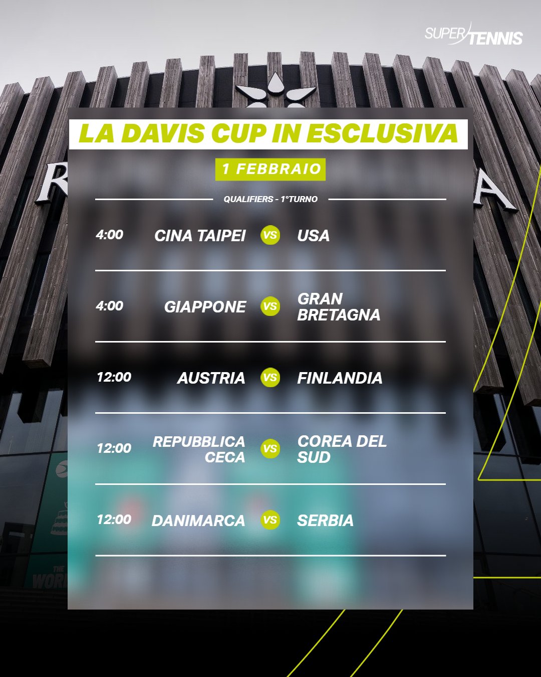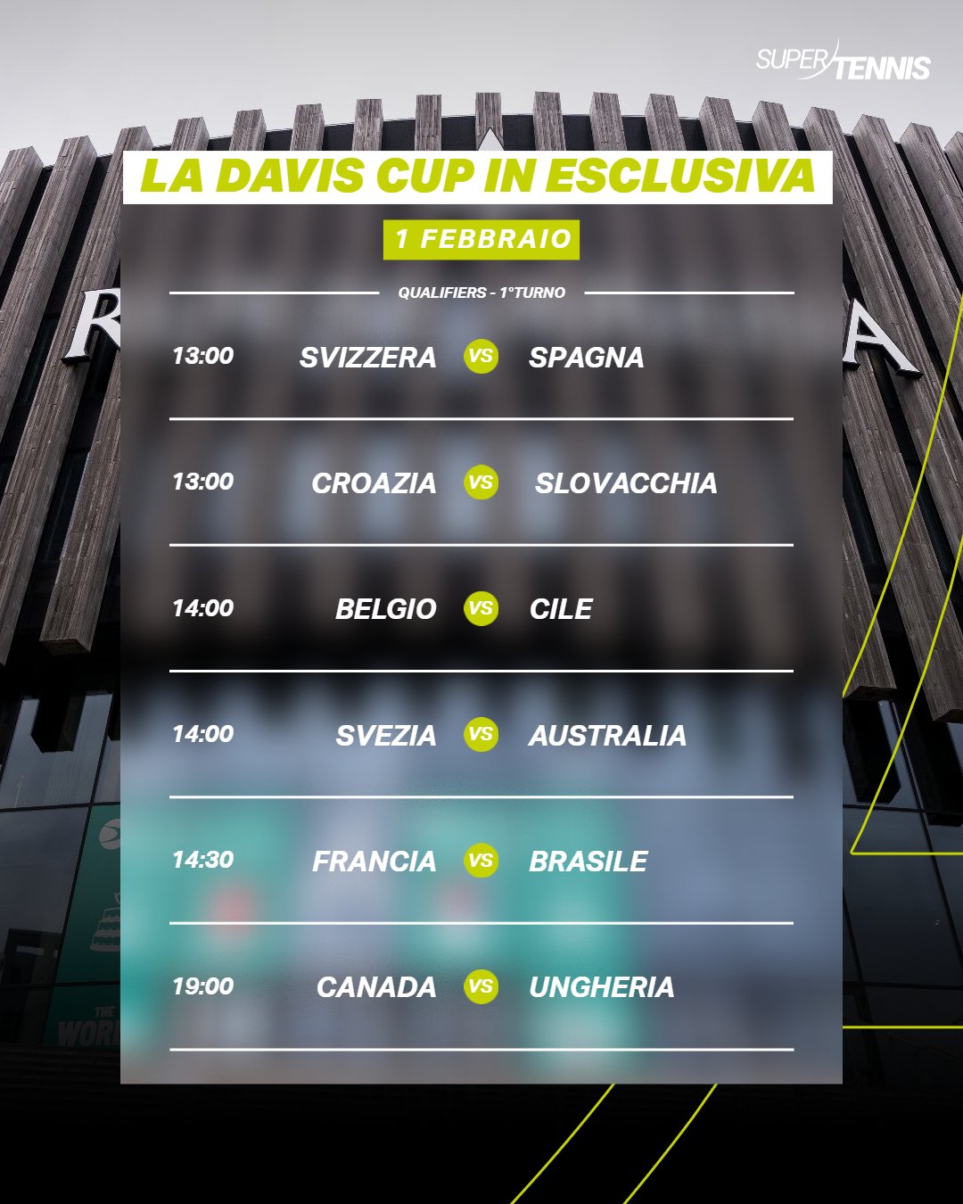 Continuano le sfide dei Qualifiers di Coppa Davis. Gli orari dei match di oggi, tutto live su SuperTennis, SuperTennis Plus e SuperTenniX
