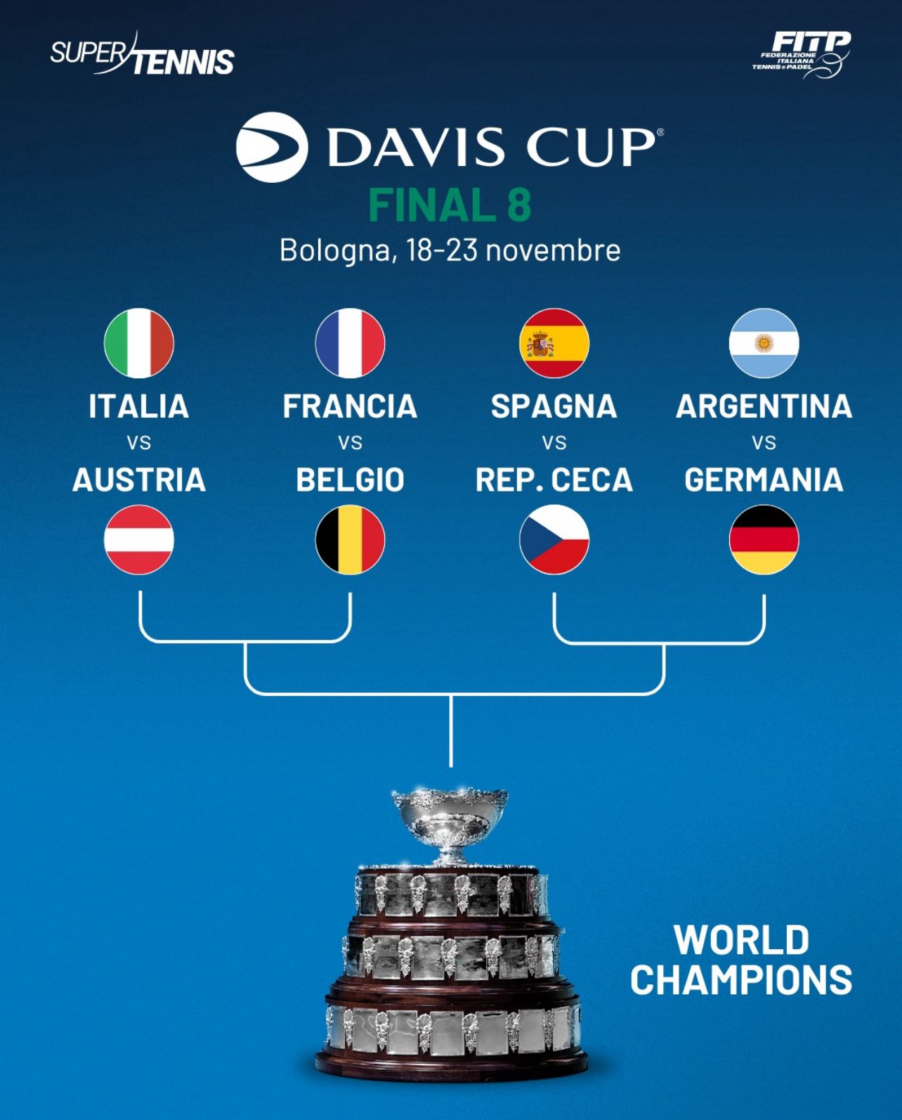 L’evento, frutto di una sinergia consolidata tra Federazione Italiana Tennis e Padel (FITP), International Tennis Federation (ITF), Regione Emilia-Romagna e Comune di Bologna, permette alla città - già sede del Group Stage della competizione dal 2022 al 2024 – di confermarsi quale punto di riferimento del grande sport internazionale e simbolo d’eccellenza della Sport Valley emiliano-romagnola. Mentre la Nazionale femminile a Shenzhen (Cina) prepara l’impegno di semifinale nelle Billie Jean King Cup Finals 2025, il capoluogo emiliano raccoglie l’eredità di Malaga, divenendo palcoscenico per lo spettacolare atto conclusivo della 113esima edizione della competizione a squadre più importante del tennis maschile. Forte della straordinaria doppietta conquistata nel 2023 e nel 2024, l’Italia si presenta da campione in carica, per la prima volta davanti al proprio pubblico. Otto le nazionali in gara, in una formula serrata e spettacolare che prevede quarti di finale, semifinali e finale in sei giorni consecutivi di grande tennis.