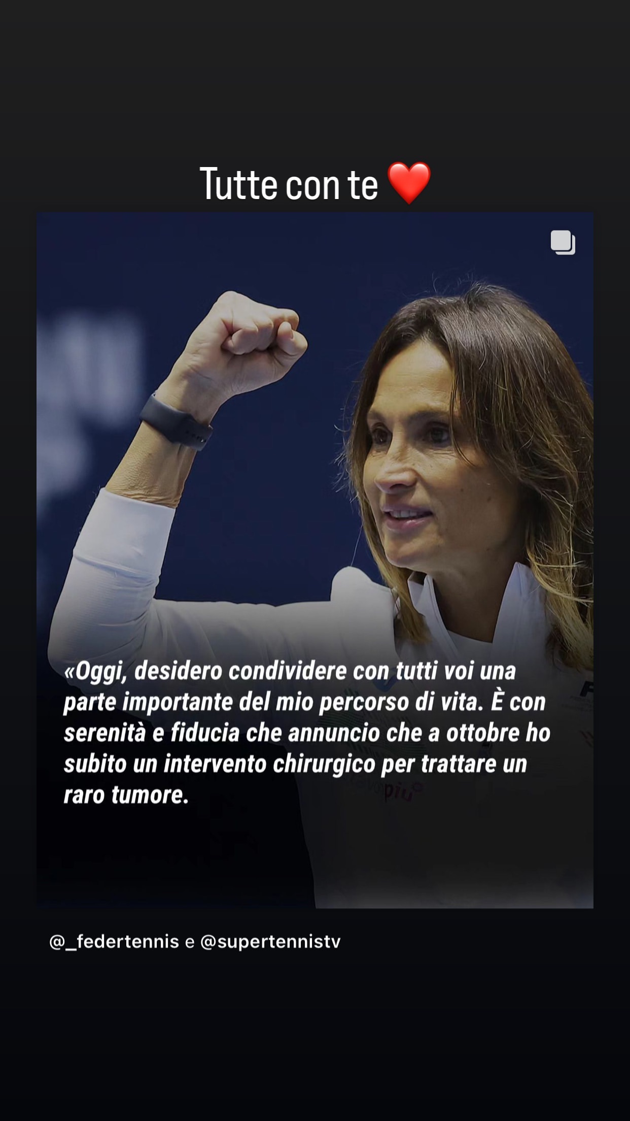 Anche Filippo Baldi si unisce all'abbraccio del tennis italiano per Tathiana Garbin. Solo "Taty" scrive su Instagram, condividendo anche lui un estratto della lettera aperta pubblicata sui profili social della Federazione Italiana Tennis e Padel e del canale SuperTennis. Accanto all'affettuoso vezzeggiativo tre icone: un braccio che mostra il bicipite, lo smiley con il bacio, una mano stretta a pugno. Chiari messaggi di vicinanza e di incoraggiamento per chi ha saputo trasmettere forza e passione.