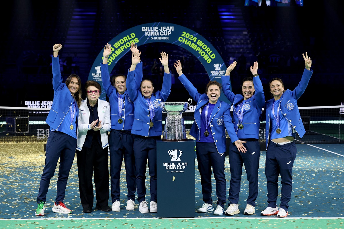 Le “ragazze irresistibili” sono tornate, e si chiamano Jasmine, Lucia, Elisabetta, Martina e Sara (anche se quest’ultima regina di Coppa lo era già stata). Eccole arrivare in conferenza stampa con le giacche da campionesse griffate BJK Cup, anch’esse azzurre…ed evidentemente non è un caso. La prima a rompere il ghiaccio è Sara Errani, in questo 2024 anche oro olimpico a Parigi in coppia con Paolini, “il cervello del team”, come la chiamano le altre: “E’ bellissimo essere di nuovo qui, sono davvero orgogliosa di far parte di nuovo di questo team. Per vincere un trofeo come questo devi essere forte sia in singolare che in doppio e lo abbiamo dimostrato. Per me il ritorno in Nazionale è stato davvero speciale”, sottolinea lei che la BJK Cup, quando si chiamava ancora la Fed Cup, l’aveva già vinta tre volte.