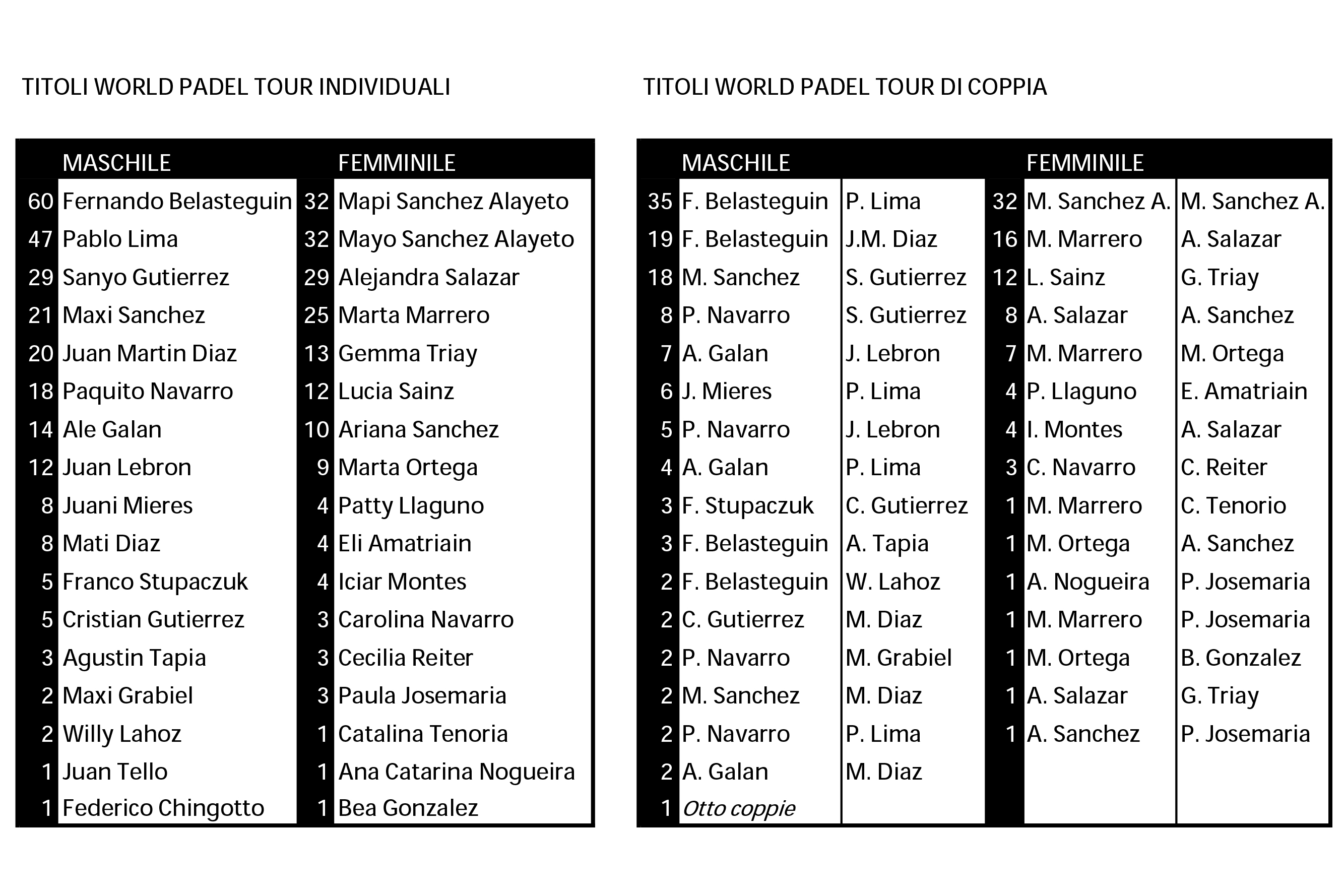 A livello individuale, fra i 17 giocatori capaci di conquistare almeno una volta un successo nel World Padel Tour, possono vantare più titoli Belasteguin e Lima di tutti gli altri quindici colleghi messi insieme. “Bela” ne ha vinti 60, e fino a qualche tempo fa aveva una percentuale di successo nettamente superiore al 50% (tradotto: vinceva più della metà dei tornei ai quali partecipava), Lima 47. Al terzo posto nella classifica c’è Sanyo Gutierrez con 29, seguito dal suo ex compagno Maxi Sanchez e da Juan Martin Diaz, grandissimo protagonista nei primi anni del circuito ma senza titoli ormai dal lontano 2015. Nell’elenco sono presenti tutti i più forti giocatori contemporanei, fino a Juan Tello e Federico Chingotto, gli ultimi capaci di scrivere il proprio nome nell’albo d’oro del WPT, vincendo lo scorso anno l’Open di Las Rozas.
