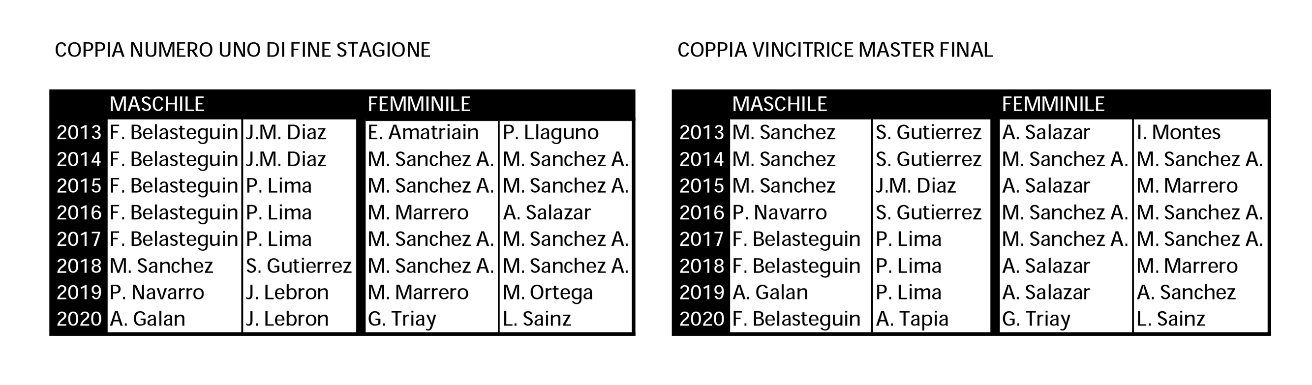 Se nel femminile le Alayeto hanno chiuso per quattro volte la stagione da numero uno, nel maschile Belstaguin ci è riuscito in cinque occasioni: le prime due con Juan Martin Diaz, le altre tre con Lima. Ma il Master Finàl è finito nelle sue mani “solo” tre volte, due con lo storico compagno brasiliano e una – lo scorso anno – col giovane Agustin Tapia, insieme al quale ha vinto anche il Sardegna Open di settembre, primo storico Open del World Padel Tour sul suolo italiano. Tre vittorie al Master Final anche Maxi Sanchez (campione nelle prime tre edizioni), per Sanyo Gutierrez e per Lima, che oltre ia due successi insieme a “Bela” se n’è preso uno anche con Ale Galan, nel 2019. Nel femminile, invece, il record di successi al Master Final è di Alejandra Salazar, campionessa quattro volte e con quattro compagne diverse. Proverà a fare cinque quest’anno, con una nuova partner al suo fianco: Gemma Triay.