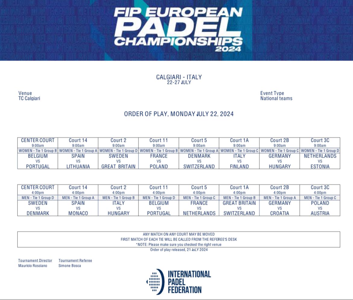 Sorteggiati i gironi dei FIP European Padel Championships che si svolgeranno dal 22 al 27 luglio al Tennis Club Cagliari. Il torneo sarà trasmesso in diretta su SuperTennis e SuperTenniX.