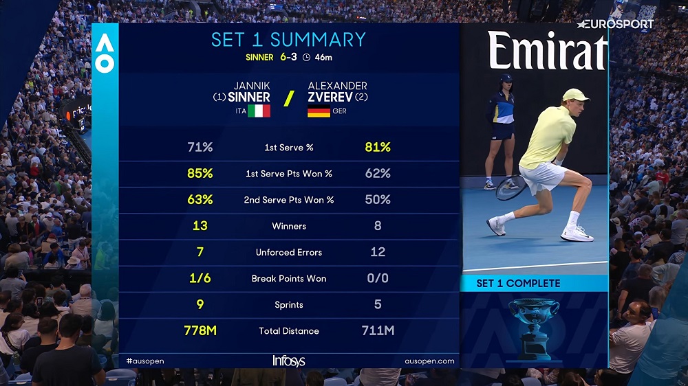 Non riesce a togliersi la soddisfazione almeno di tenere un unico turno di battuta a zero nel match il tedesco, perché l’azzurro lascia partire un missile terra-aria di diritto, però il game lo porta a casa (5-3). Con un diritto lungolinea largo di “Sascha” arriva il match-point per Jannik che trasforma con un drop-shot seguito da un passante incrociato. GAME, SET, MATCH! E terzo titolo Slam in tre finali disputate…