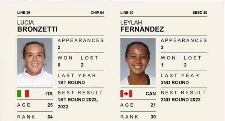 Seguendo l’ordine del tabellone Lucia Bronzetti, n.81 WTA, - unica italiana sorteggiata nella parte alta (in campo martedì) - ha “pescato” la canadese Leylah Fernandez, n.25 del ranking e 30 del seeding, che partecipa solo per la terza volta al main draw dello Slam londinese dove solo lo scorso anno ha passato un turno. Tra Lucia e la 21enne di Montreal, apparsa in grande spolvero ad Eastbourne dove ha raggiunto la finale, non ci sono precedenti.
