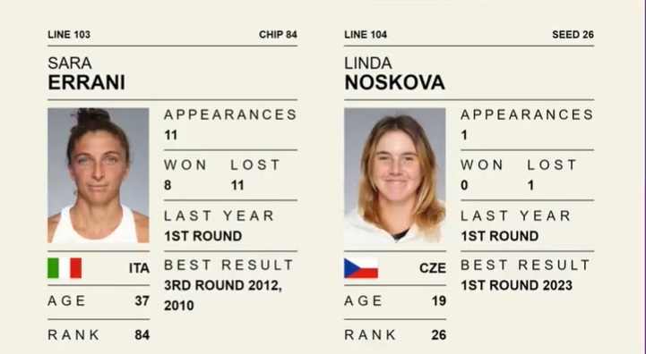 Sorteggio insidioso per Sara Errani, n.86 WTA, che trova dall’altra parte della rete la ceca Londa Noskova, b. 26 del ranking e del seeding, al suo secondo Slam londinese dove deve ancora vincere un match. Tra la romagnola e la 19enne di Vsetin, quest’anno arrivata nei quarti all’Australian Open, non ci sono precedenti.