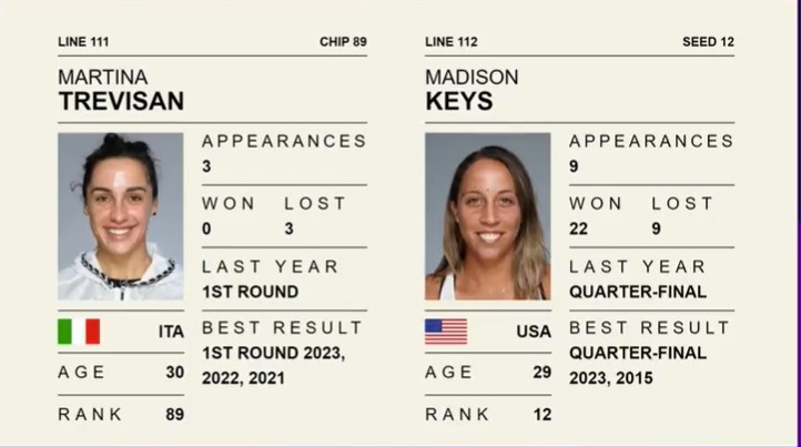 Per Trevisan, alla quarta partecipazione al main draw (la settima complessiva), stesso discorso di Bronzetti: tre sconfitte al primo turno per la 30enne mancina di Firenze e nessun set vinto (nel 2021 battuta dalla russa Vesnina, nel 2022 stoppata da Cocciaretto, nel 2023 sconfitta dalla spagnola Sorribes Tormo).