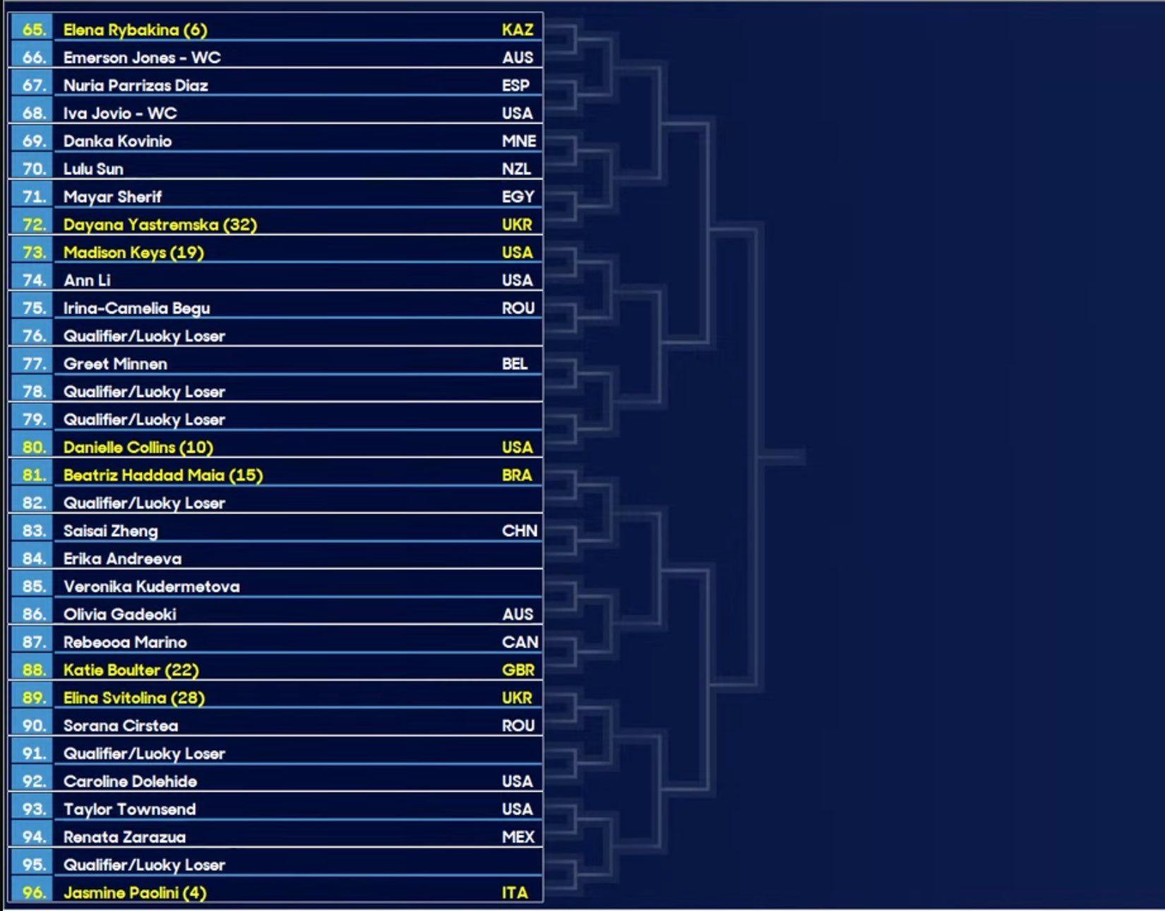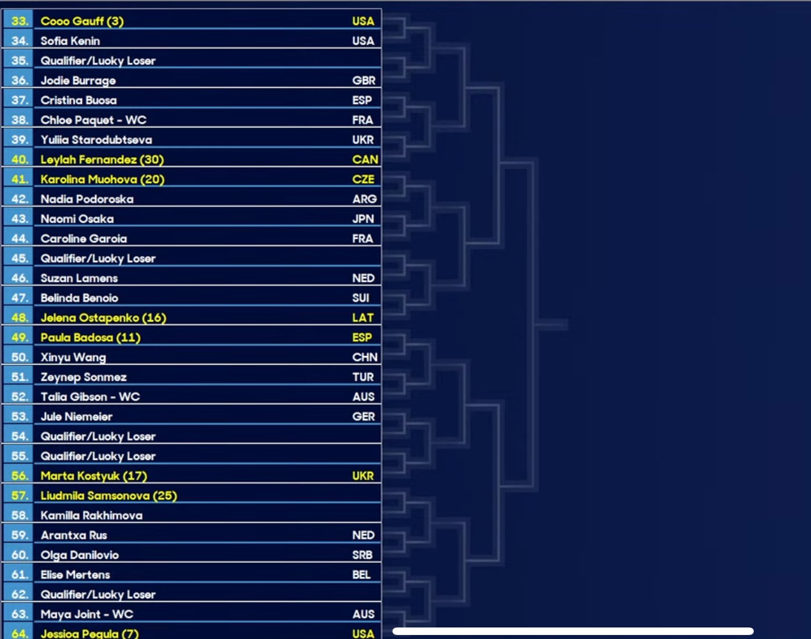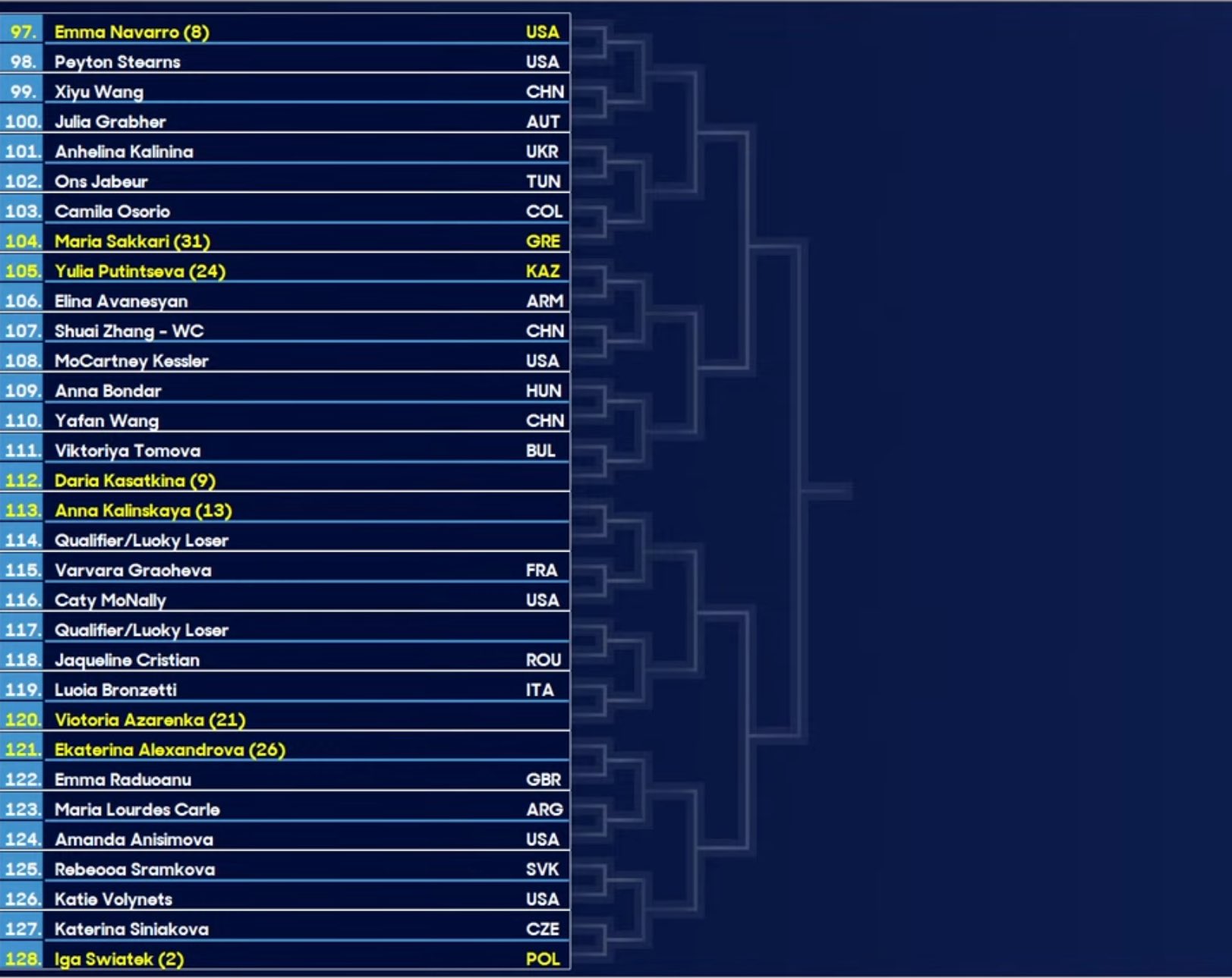 La testa di serie più alta nell'altro ottavo di questa sezione, dunque potenziale avversaria di Swiatek nei quarti, è Emma Navarro. La statunitense, numero 8 del tabellone, affronta al primo turno Peyton Stearns in un derby che mette di fronte anche due ex campionesse del circuito universitario NCAA. Nel suo spicchio di tabellone anche Daria Kasatkina, testa di serie numero 9, e Maria Sakkari (31) che potrebbe affrontare al secondo turno Ons Jabeur.
