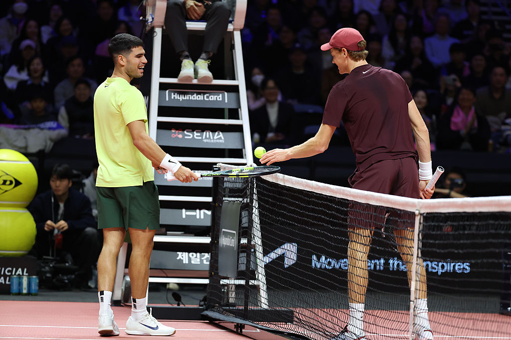 La stretta di mano tra Jannik Sinner e Carlos Alcaraz in esibizione a Seul (Getty Images)