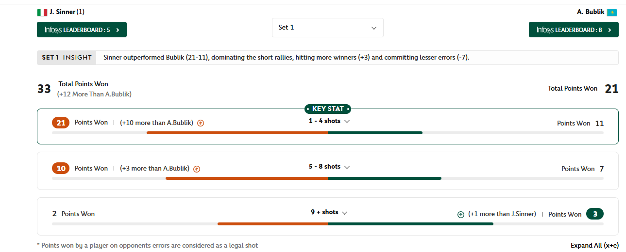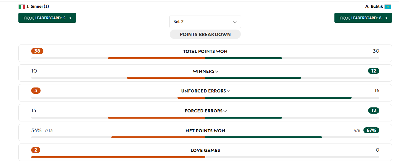 Nel secondo, come si può vedere, Bublik rischia di più e fa anche due vincenti in più di Sinner. Il quale, però, rimane solidissimo e si concede solamente tre errori gratuiti, "pungendo" sempre al momento giusto