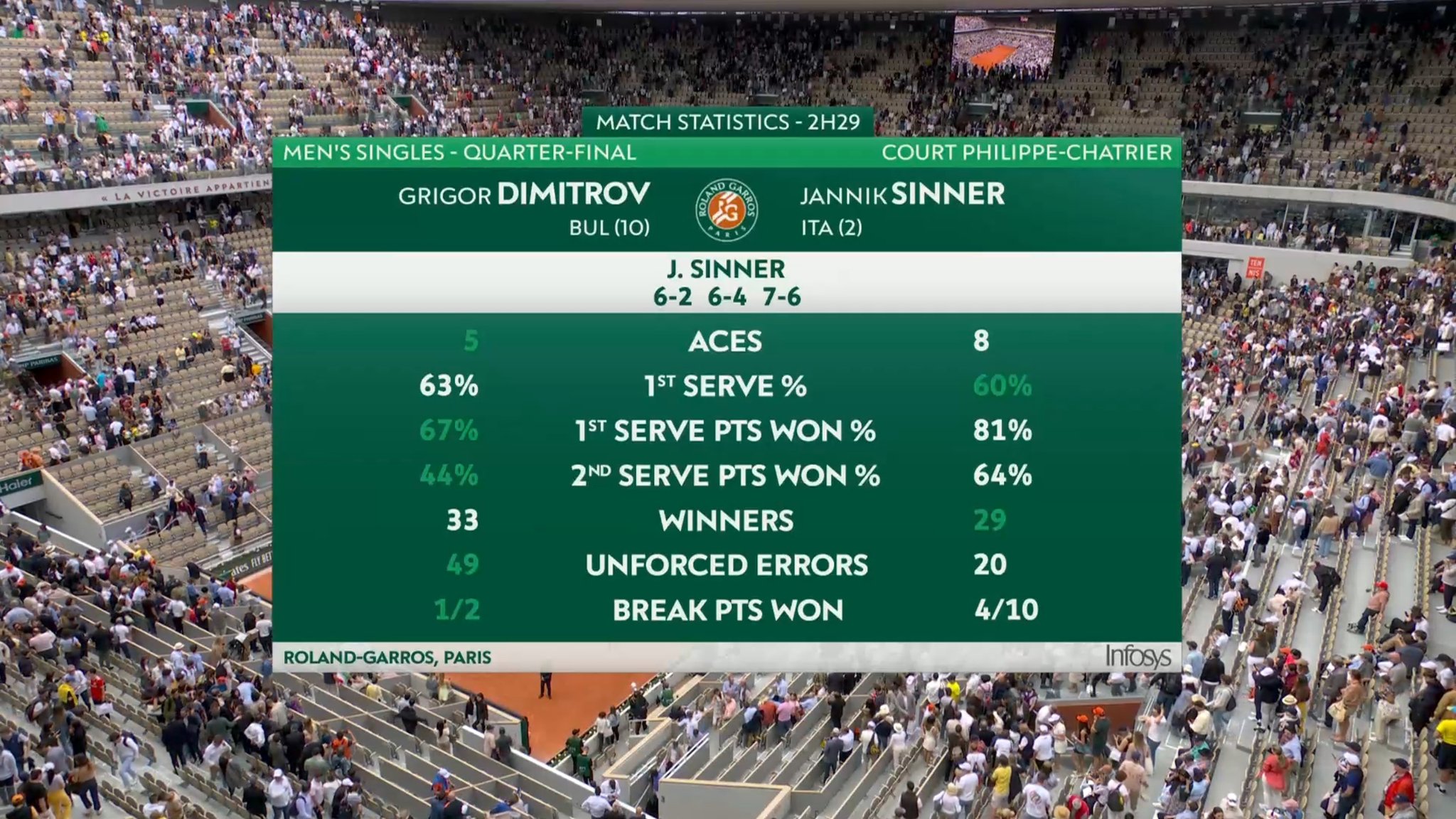 statistiche finali Sinner-Dimitrov QF Roland Garros 2024