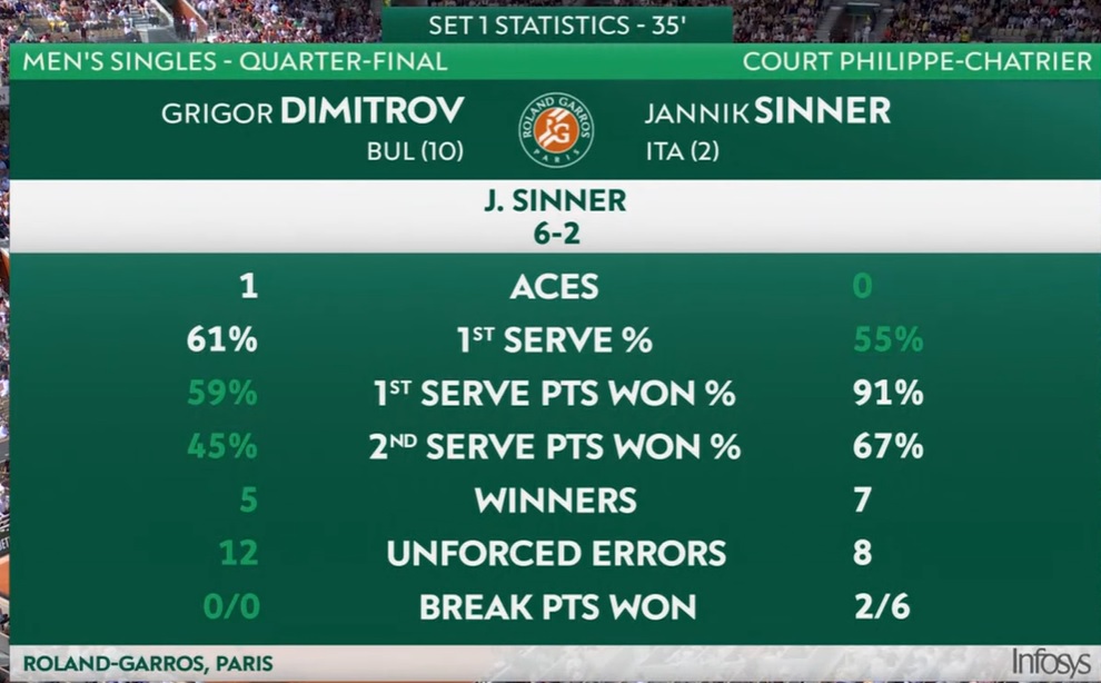 Statistiche primo set Sinner-Dimitrov QF Roland Garros 2004
