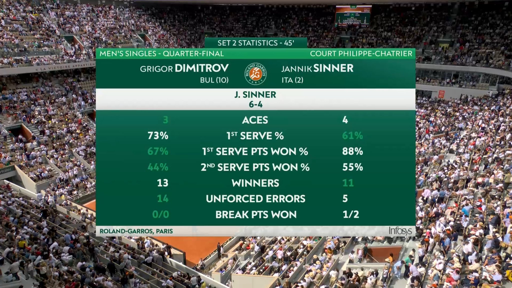 statistiche secondo set Sinner-Dimitrov QF Roland Garros 2024