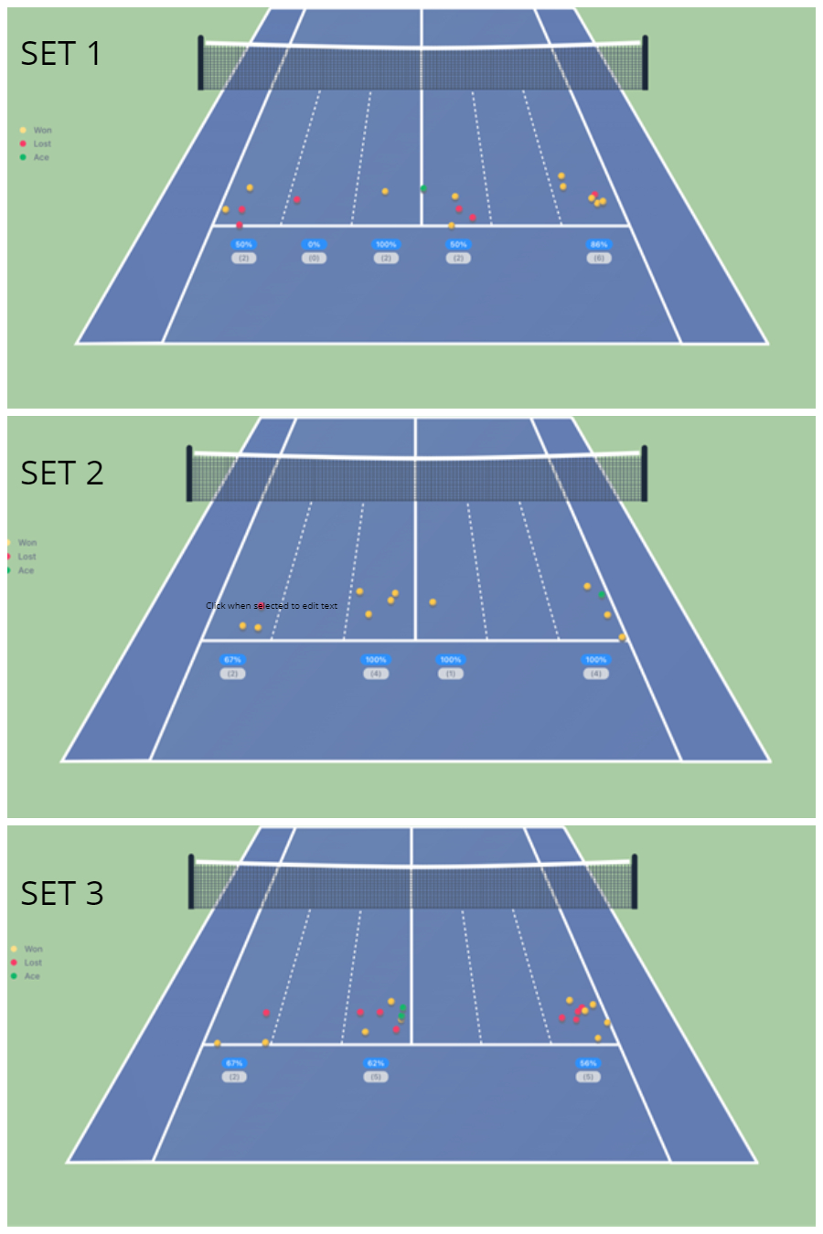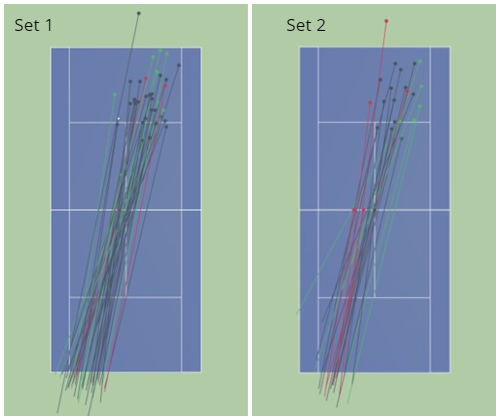 Fritz ha fatto ricorso al cambio in lungolinea per uscire dal duello sulla diagonale, prevedibilmente con maggiore efficacia nel secondo set, quello che ha vinto. Significativo come nel terzo set abbia raddoppiato il numero di diritti lungolinea giocati rispetto al secondo parziale, ma è passato dal 57% al 25% di punti vinti quando ha giocato questo colpo. Simile, peraltro, la resa con il rovescio lungolinea.