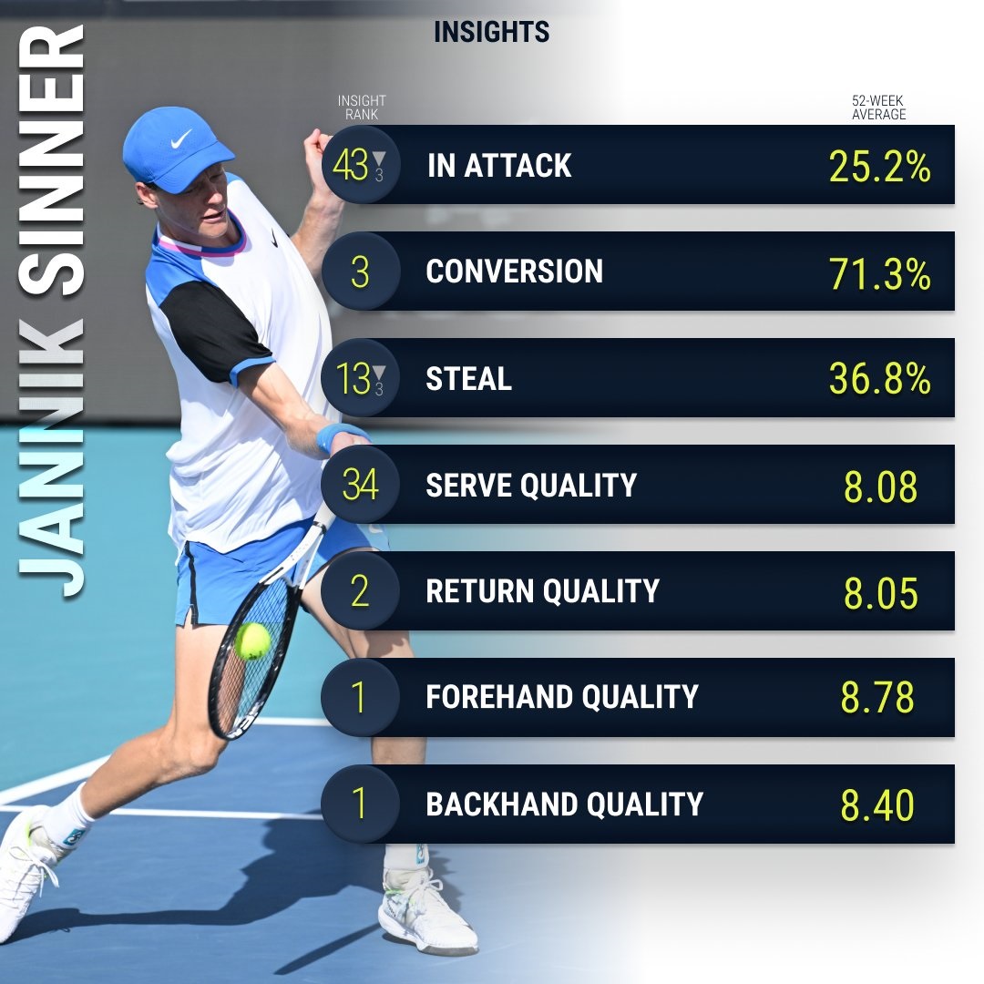 In risposta, è più evidente la superiorità di Sinner, settimo nel circuito Atp mentre Fritz è solo 24mo secondo l'omologo indicatore. Inoltre nessuno gestisce i momenti di pressione (palle break, tie-break, set decisivi) come Sinner nelle ultime 52 settimane a livello Atp.