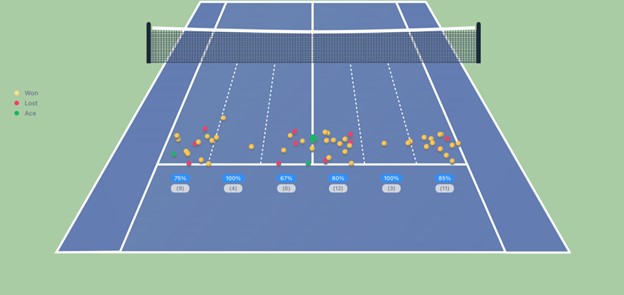 In quella sfida, Fritz ha servito la prima con altissima frequenza contro il diritto di Jannik, ovvero a uscire da destra e al centro da sinistra: 8 volte nel primo set su 18 punti in cui ha messo in campo la prima; 8 su 12 nel secondo set, 17 su 20 nel terzo. Quando ha servito la prima contro il diritto di Sinner, ha vinto 7 punti su 8 nel primo set, 8 su 8 nel secondo, 10 su 17 nel terzo.
