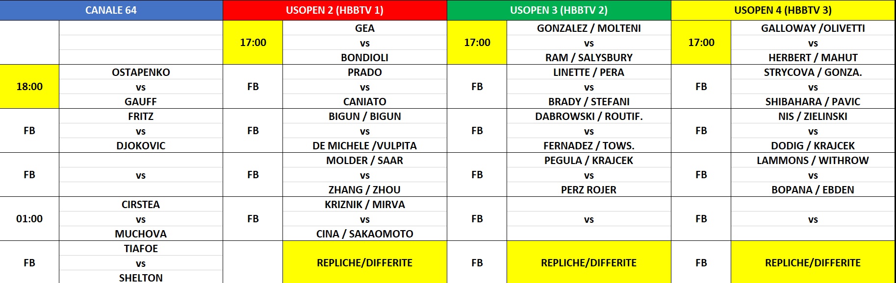 La programmazione di SuperTennis e SuperTennis per la prima giornata dedicata ai quarti di finale dello US Open. Djokovic-Fritz e Tiafoe-Shelton in singolare maschile. Muchova-Cirstea e Ostapenko-Gauff al femminile. Su HbbTV e SuperTenniX doppi e junior con gli italiani ancora protagonisti