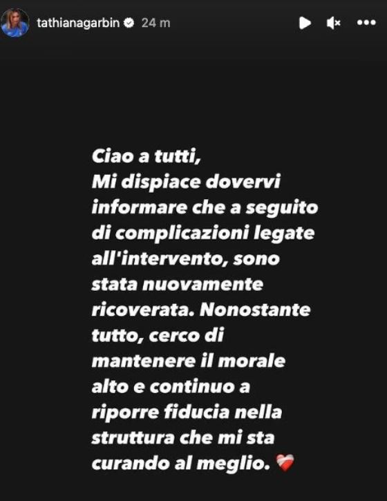 "Ciao a tutti, mi dispiace dovervi informare che a seguito di complicazioni legate all'intervento, sono stata nuovamente ricoverata. Nonostante tutto, cerco di mantenere il morale alto e continuo a riporre fiducia nella struttura che mi sta curando al meglio", ha postato Garbin.
