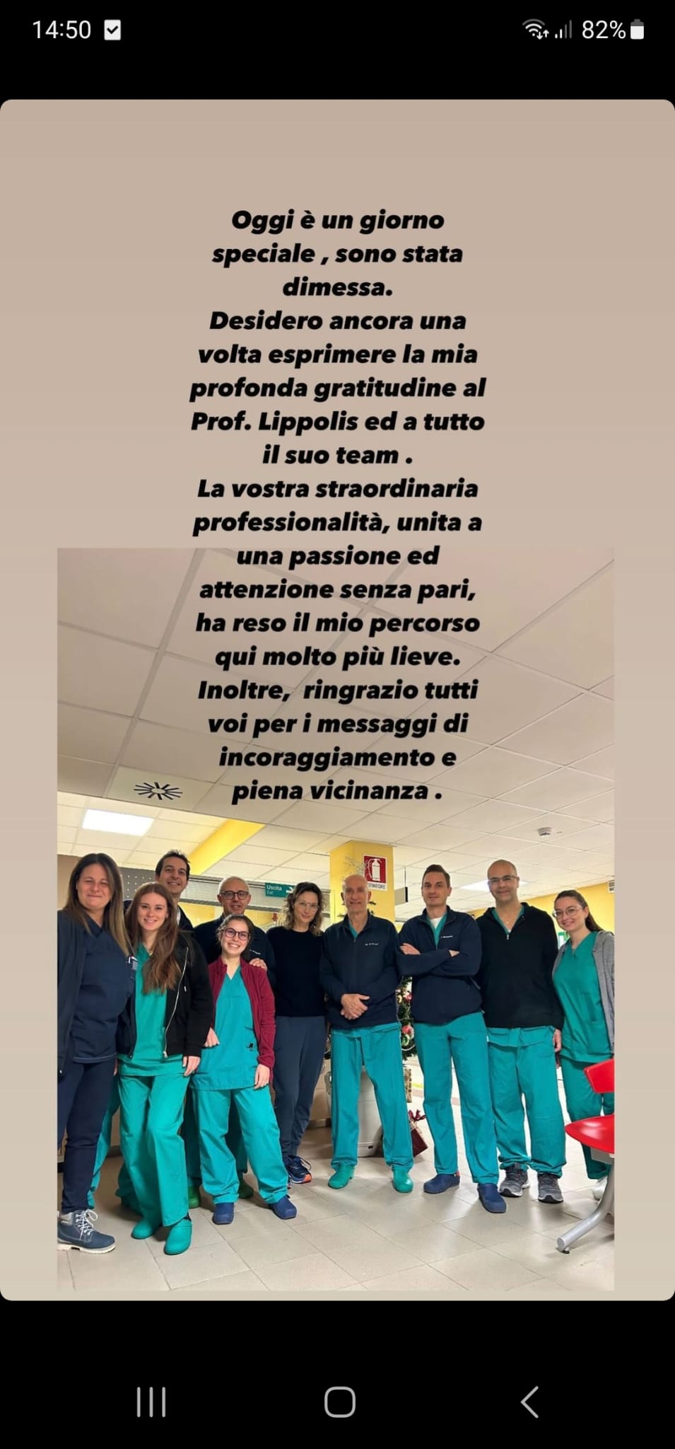 Ora la bella notizia delle dimissioni: “Oggi è un giorno speciale, sono stata dimessa. Desidero ancora una volta esprimere la mia profonda gratitudine al Prof. Lippolis ed a tutto il suo team. La vostra straordinaria professionalità, unita a una passione ed attenzione senza pari, ha reso il mio percorso qui molto più lieve. Inoltre, ringrazio tutti voi per i messaggi di incoraggiamento e piena vicinanza” .