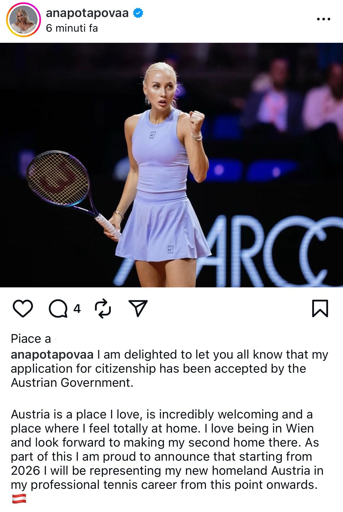 "L’Austria è un posto che amo, è incredibilmente accogliente ed è un luogo in cui mi sento completamente a casa. Amo stare a Vienna e non vedo l’ora di farne la mia seconda casa. Per questo motivo sono orgogliosa di annunciare che, a partire dal 2026, rappresenterò la mia nuova patria, l’Austria, nella mia carriera professionistica nel tennis da questo momento in poi" ha concluso Potapova, che nel 2025 ha vinto il terzo titolo WTA in singolare a Cluj-Napoca e raggiunto i quarti in doppio al Roland Garros.