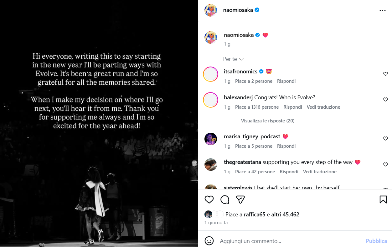 Non è una notizia certamente paragonabile alla rottura tra Carlos Alcaraz e Juan Carlos Ferrero, ma in vista del 2026 c’è un’importante novità anche per quanto riguarda Naomi Osaka. La giapponese ha infatti comunicato sui proprio social che si separerà dall’agenzia Evolve.