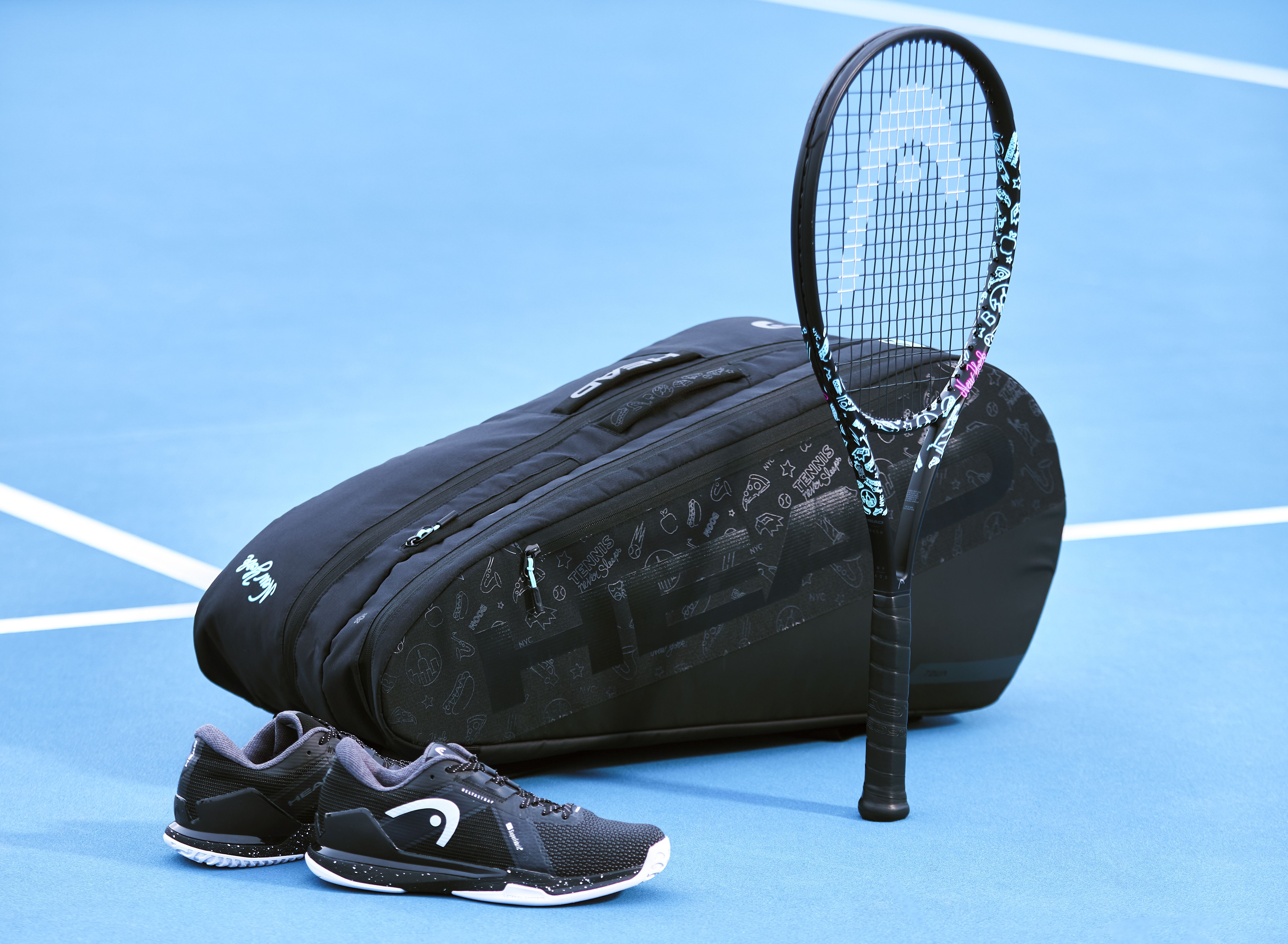 Le racchette sono accompagnate da accessori coordinati — tra cui borse XL e L (rispettivamente per 12 e 9 racchette) e uno zaino da 25L — con stampe riflettenti e dettagli moderni, pensati per chi vuole distinguersi anche fuori dal campo.