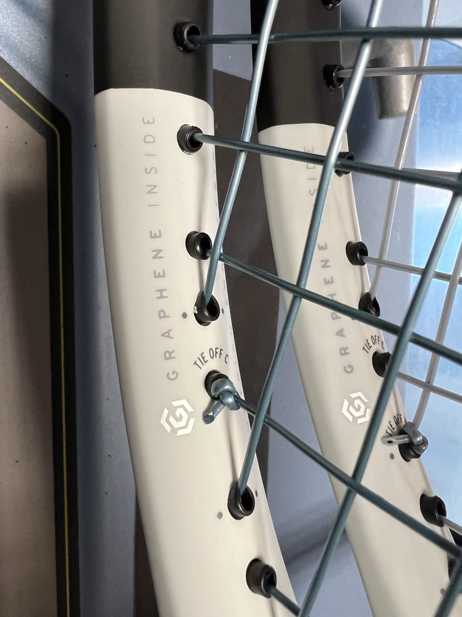 Seguendo le logiche di cui parlavamo in precedenza abbiamo incordato il nostro esemplare di Head Speed MP con un filamento più sottile ed elastico di quello che utilizza Sinner (Head Hawk Power calibro 1,21 mm anzichè Head Hawk Touch calibro 1,30 mm) e a una tensione molto inferiore alla sua (21 Kg per le verticali e 20 Kg per le orizzontali anziché 28 kg uniformi come fa Jannik).