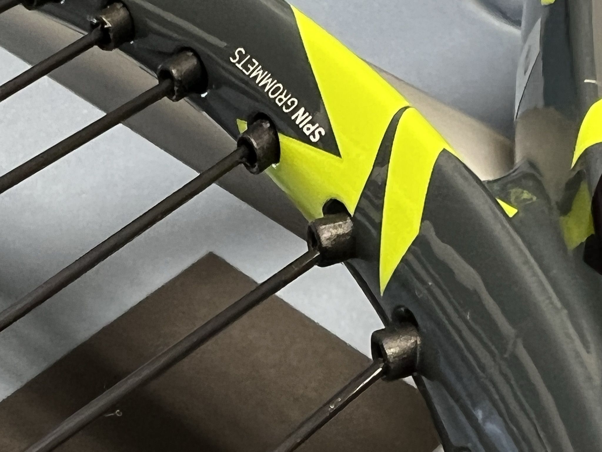 Gli Spin Grommets, alla base dell'ovale e in testa, sono fori passacorde allungati per permettere maggior libertà di movimento alla corda e una coseguente maggior presa delle rotazioni.